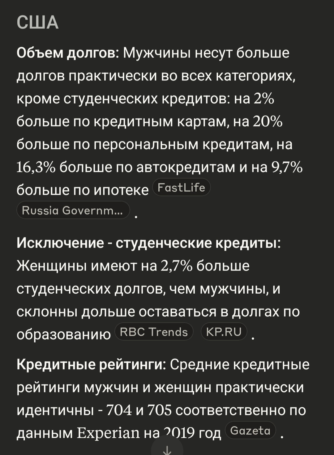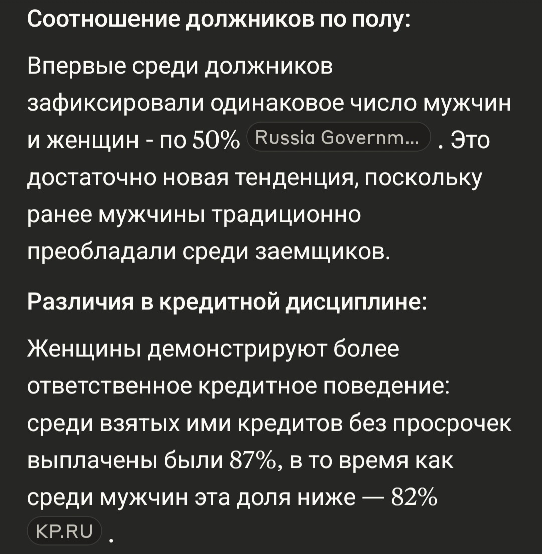 >Можно ещё и привести то, что 80% всех кредитов-долгов держат женщины, т.е. женщины охотнее живут не по средствам. Пока не доказано, не ебет что сказано. Есть различия в пары процентов в некоторых странах, где женщины имеют больше задолженность, но ни о каких 80% речи точно не идет