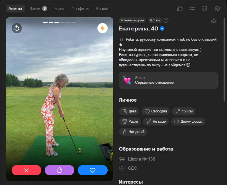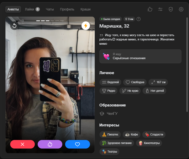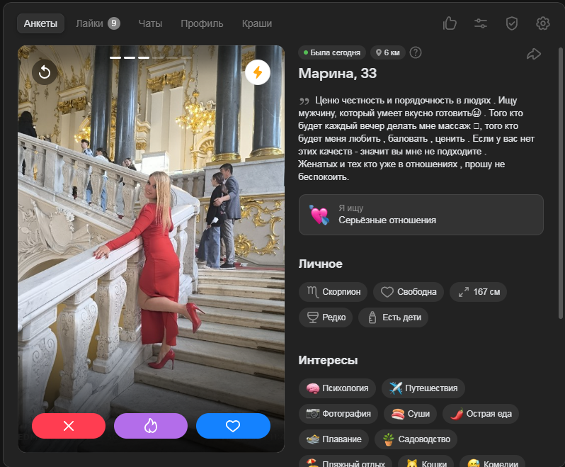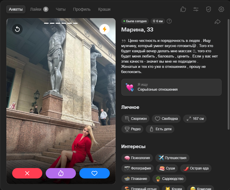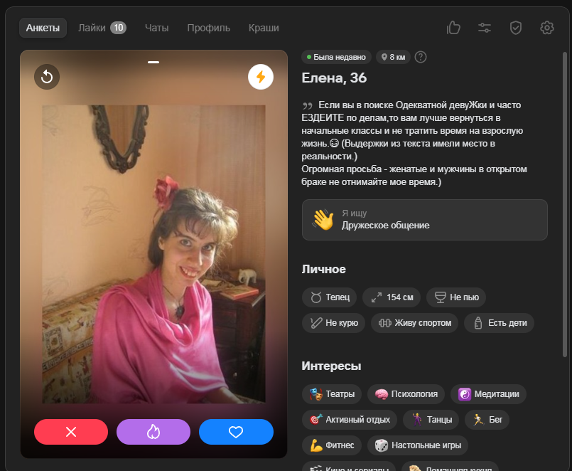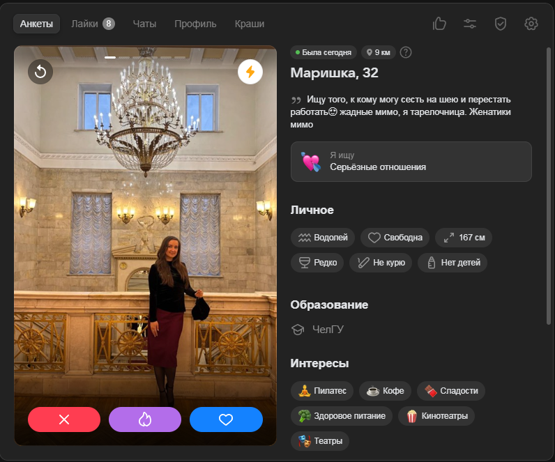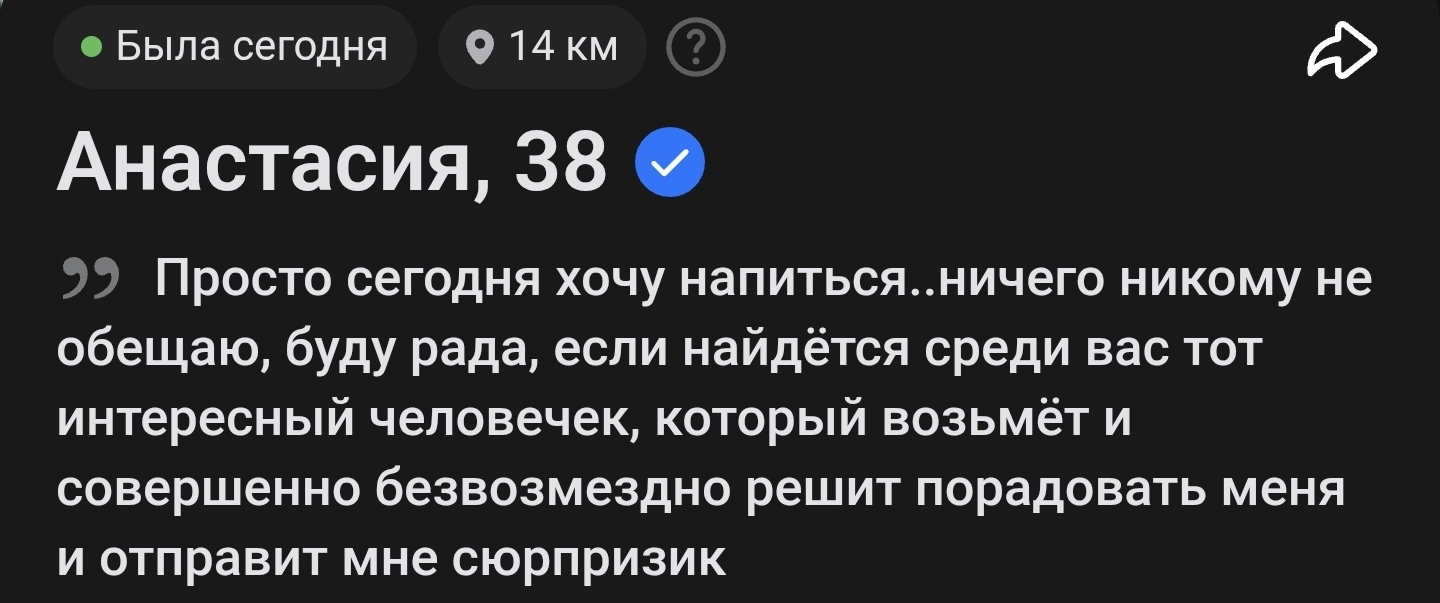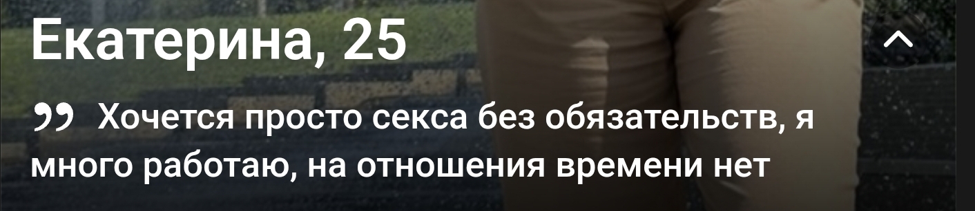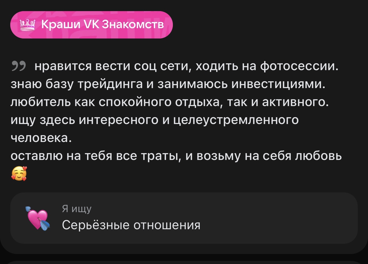 Я вот просто сижу и читаю анкеты, для кого они пишут? Основная масса мужчин уже давно как понимает и знает про супер-меркантильных баб тарелочниц, в моем случае я сразу скипаю анкету, видно что в голове говно какое то. Даже если она считает себя какой то не ебаться юмористкой, то это не отменяет тот факт, что такая хуйня в анкете отталкивает. Разве нет?