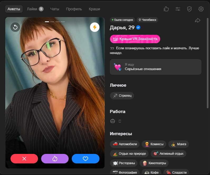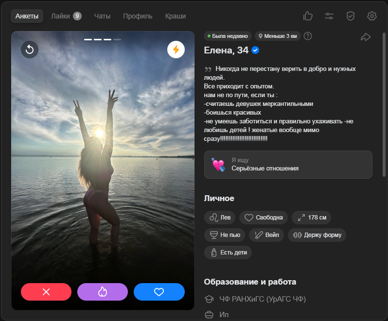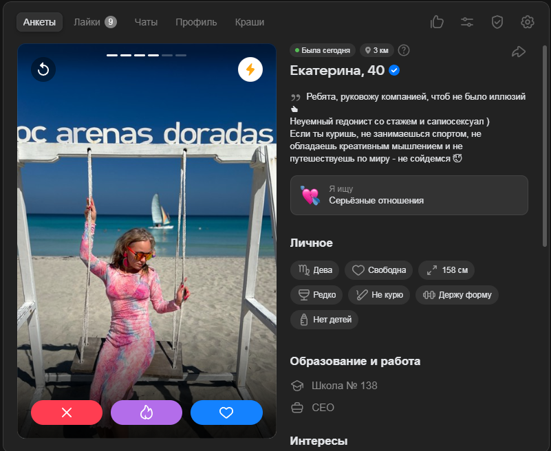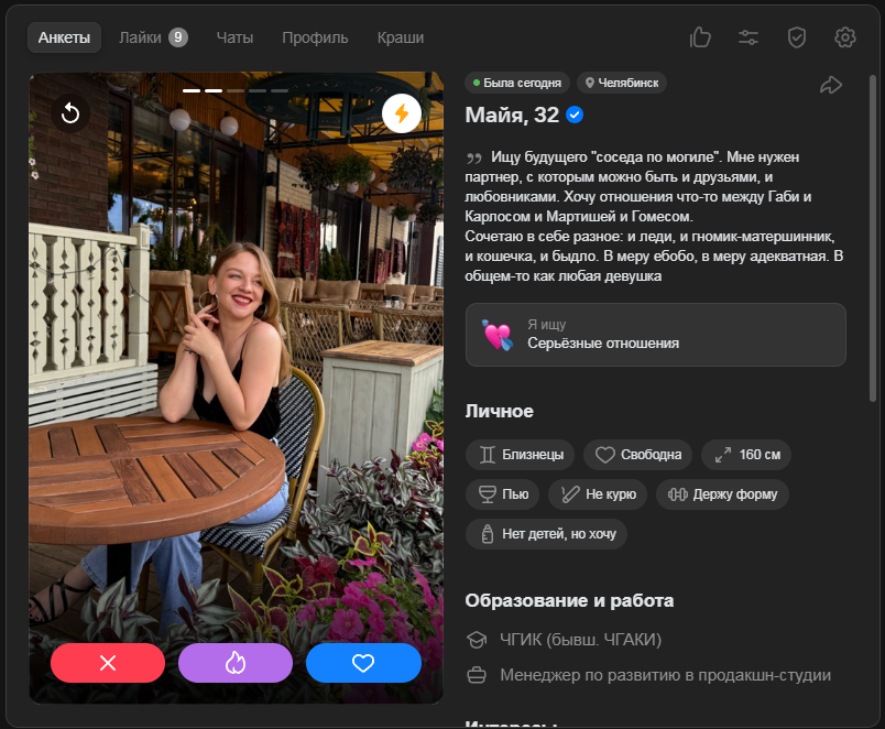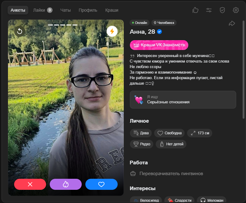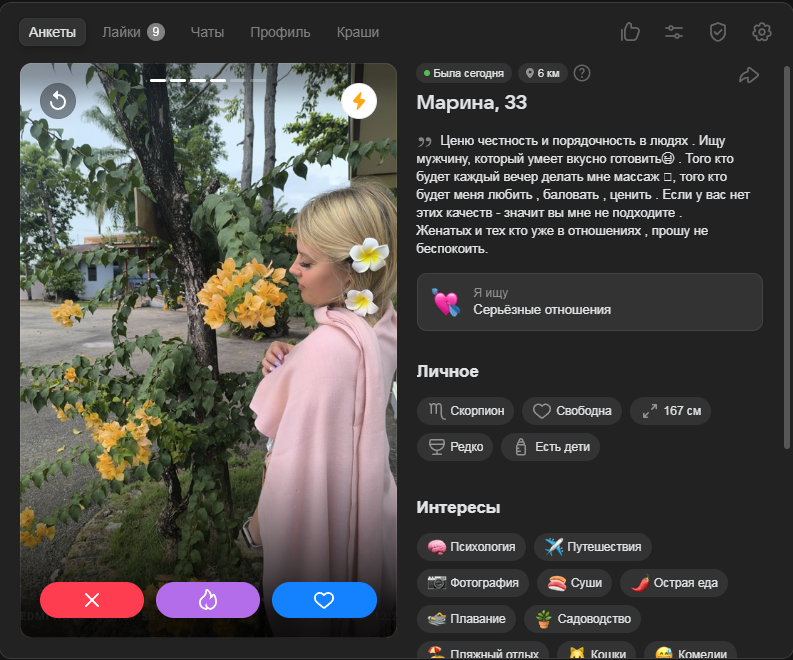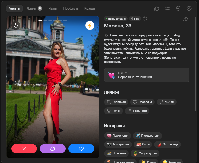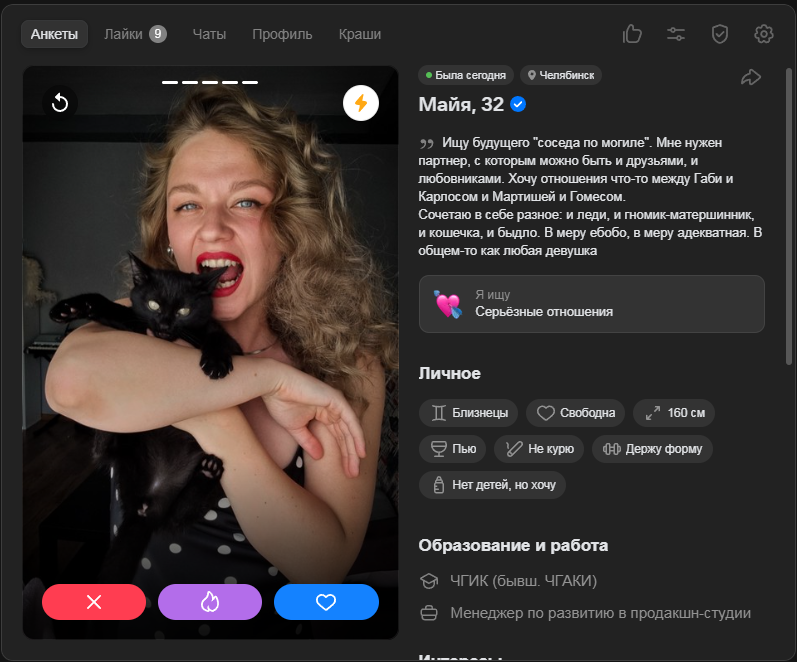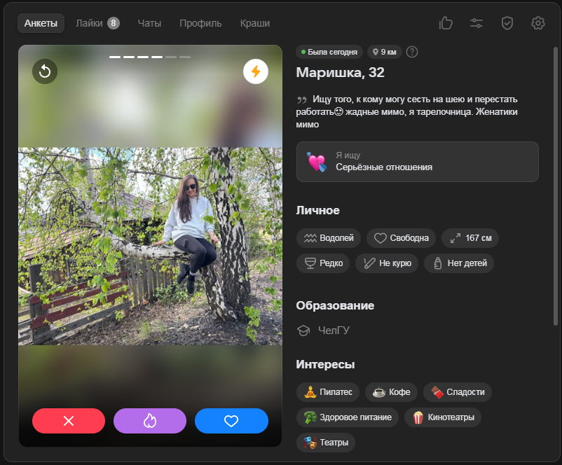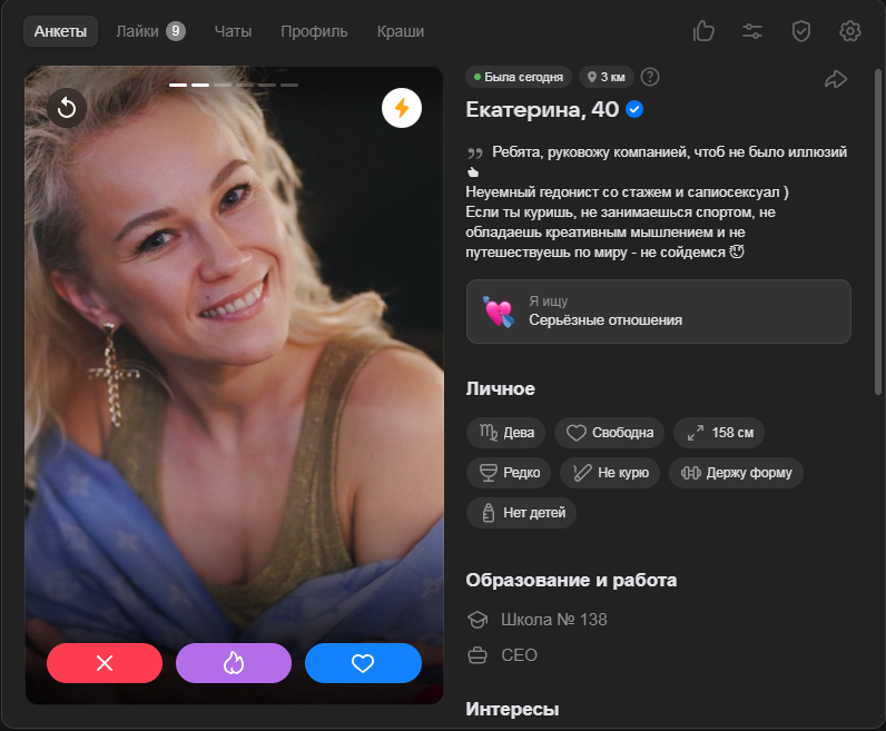 Я вот просто сижу и читаю анкеты, для кого они пишут? Основная масса мужчин уже давно как понимает и знает про супер-меркантильных баб тарелочниц, в моем случае я сразу скипаю анкету, видно что в голове говно какое то. Даже если она считает себя какой то не ебаться юмористкой, то это не отменяет тот факт, что такая хуйня в анкете отталкивает. Разве нет?