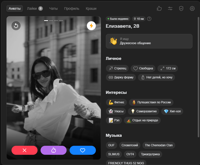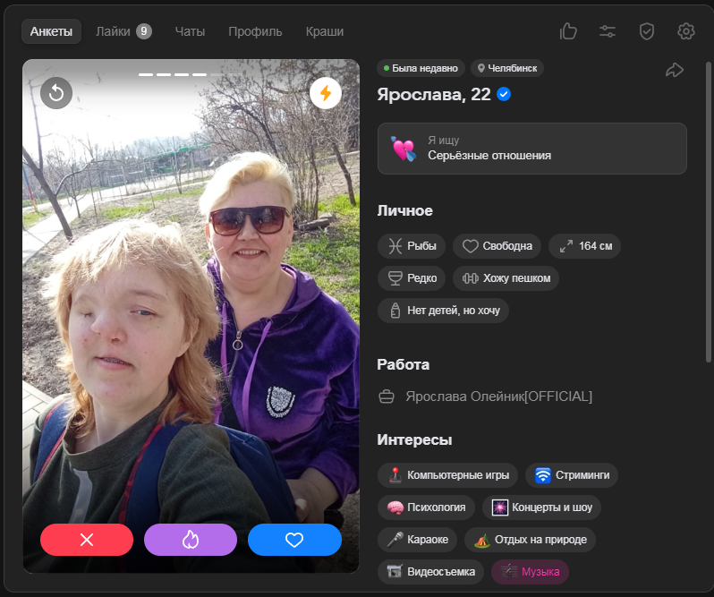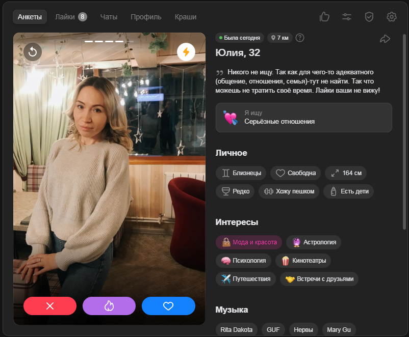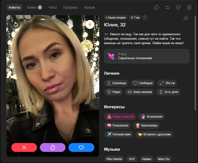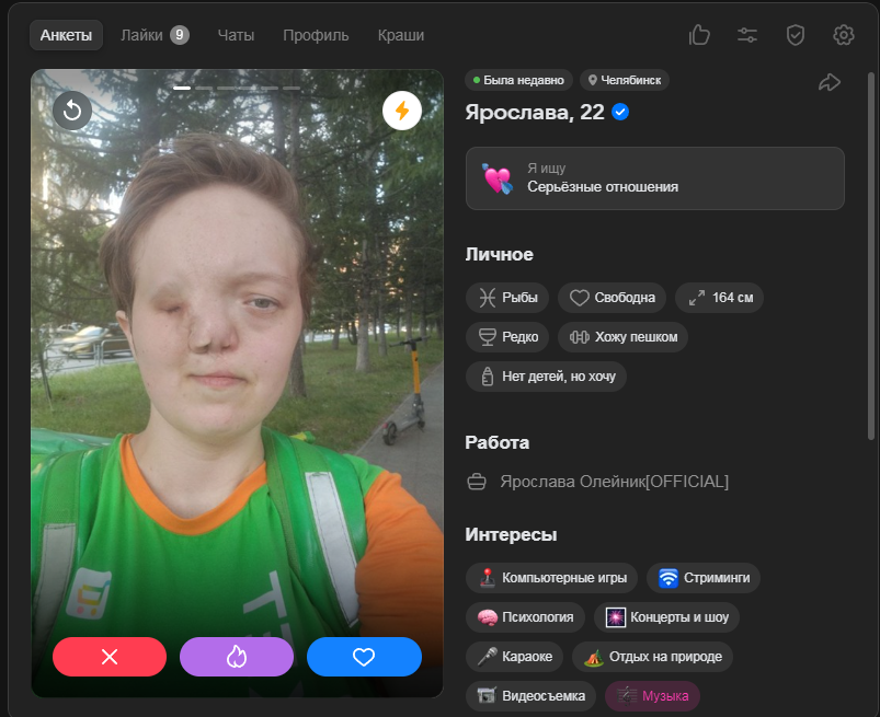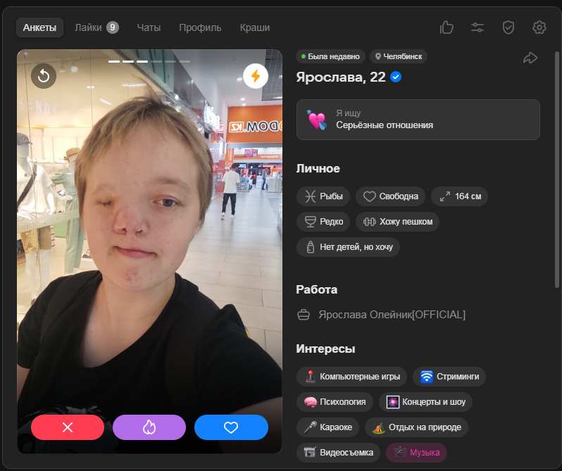 Касательно моей ситуации, все иначе. Выгляжу я не как скуф в 25 лет фф 8-9, но и до патлатых нефоров, кумиров малолетних зумерш из тиктока не дотягиваю. Но у этой среднетян такого и не будет никогда, максимум в роли фвб, хули она настолько тупая, чтобы это понять? Это все равно, если бы я намеренно искал только солевых альтух с разноцветными волосами и тонной макияжа.