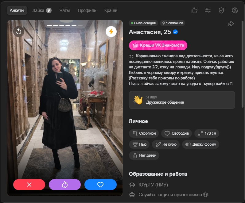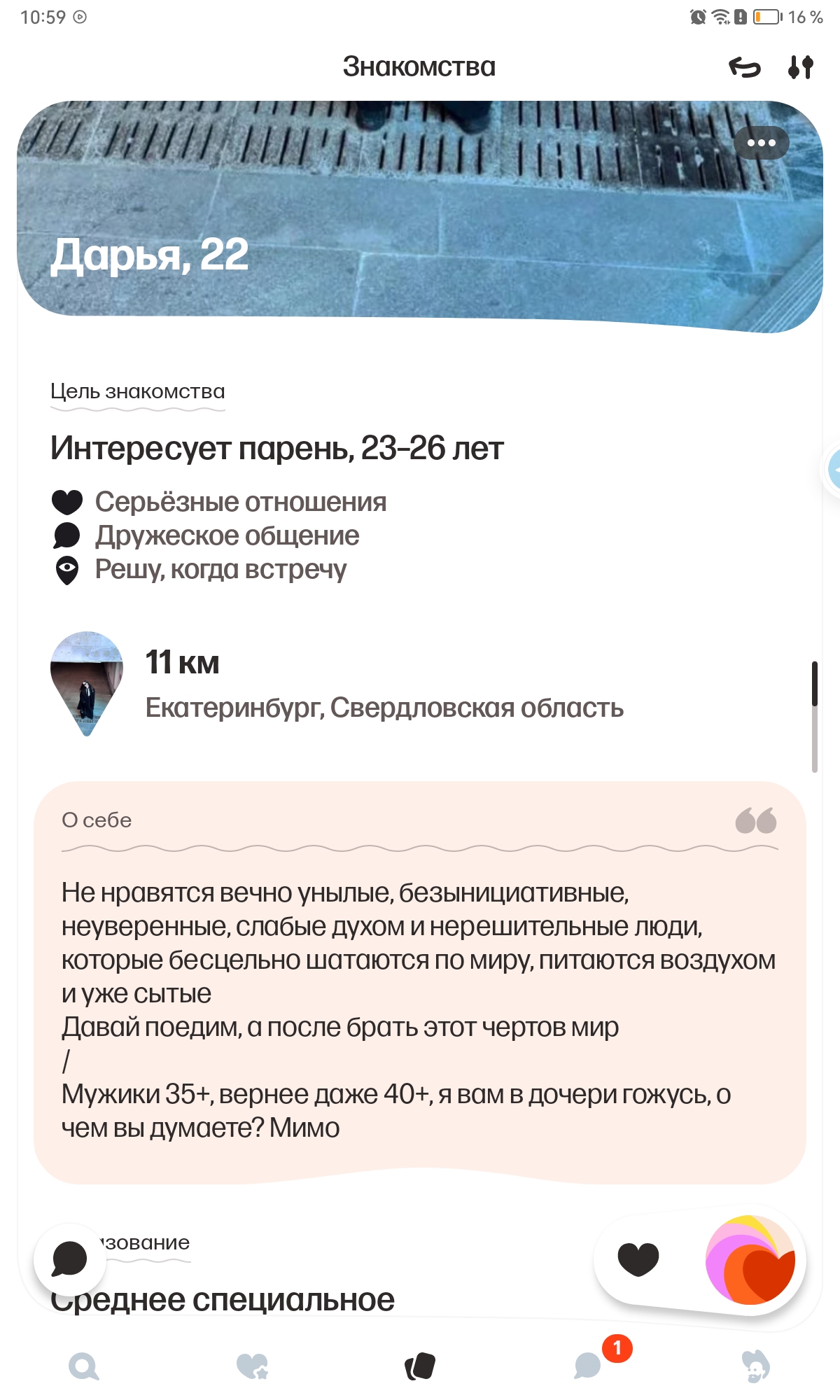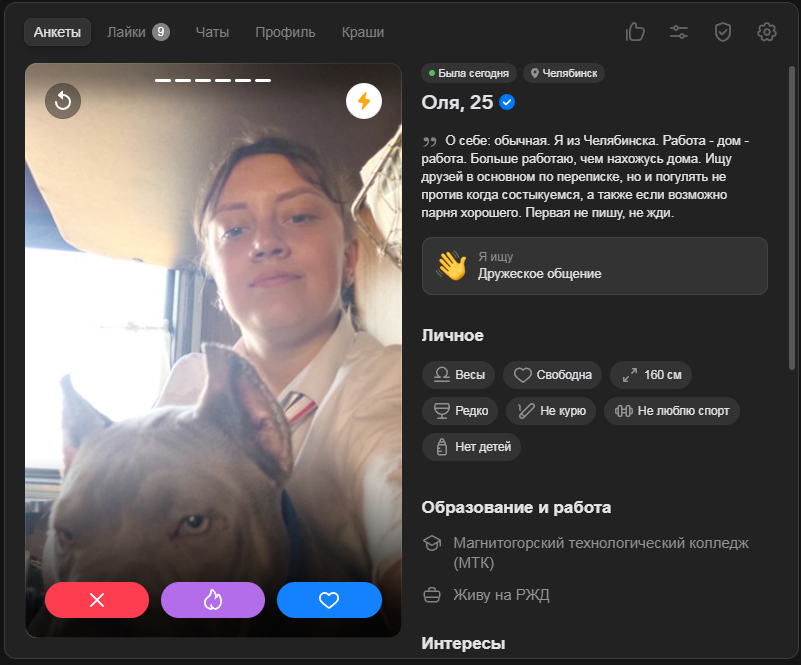 Ну это как бы база треда для среднекунов, да. Нужно подзаебаться над текстом анкеты и фотками, чтобы пошёл хоть какой-то клёв от тянок одного с тобой уровня. Но вытянуть среднетянку всё же реально. Никакого блекпилла.