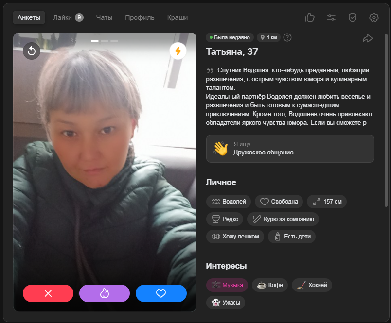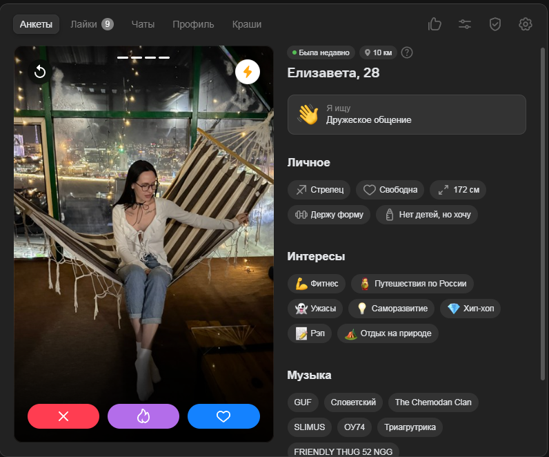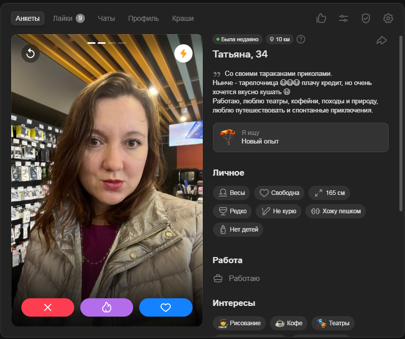 на следующий день вижу эту тянку на тиндере, в новых анкетах скидываю оффлайн-познакомиксу тот ей пишет лайтовое смс типа вчера виделись, го сириу вместе посмотрим