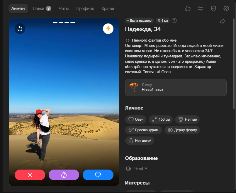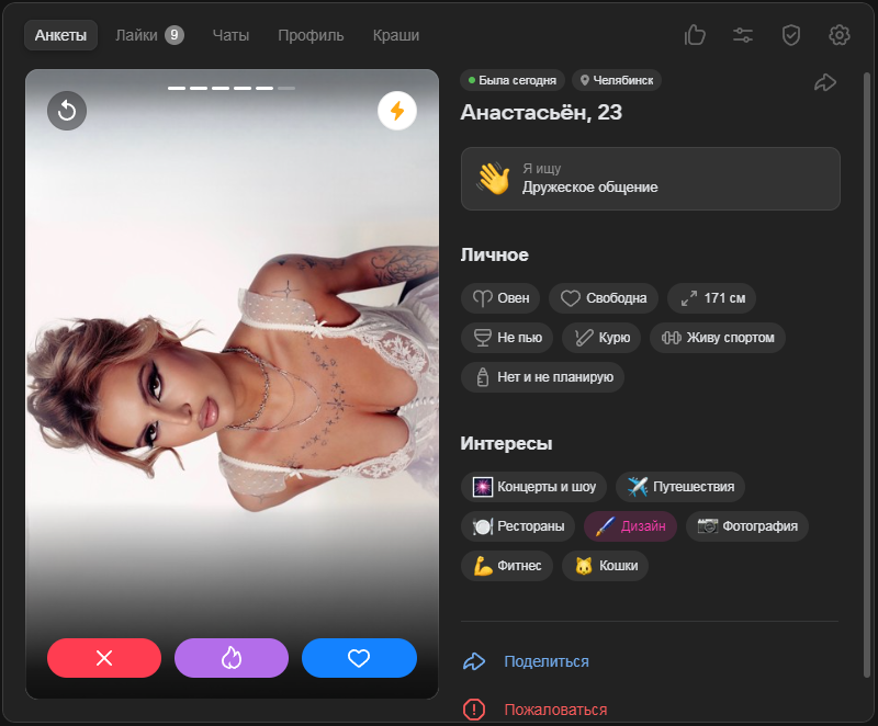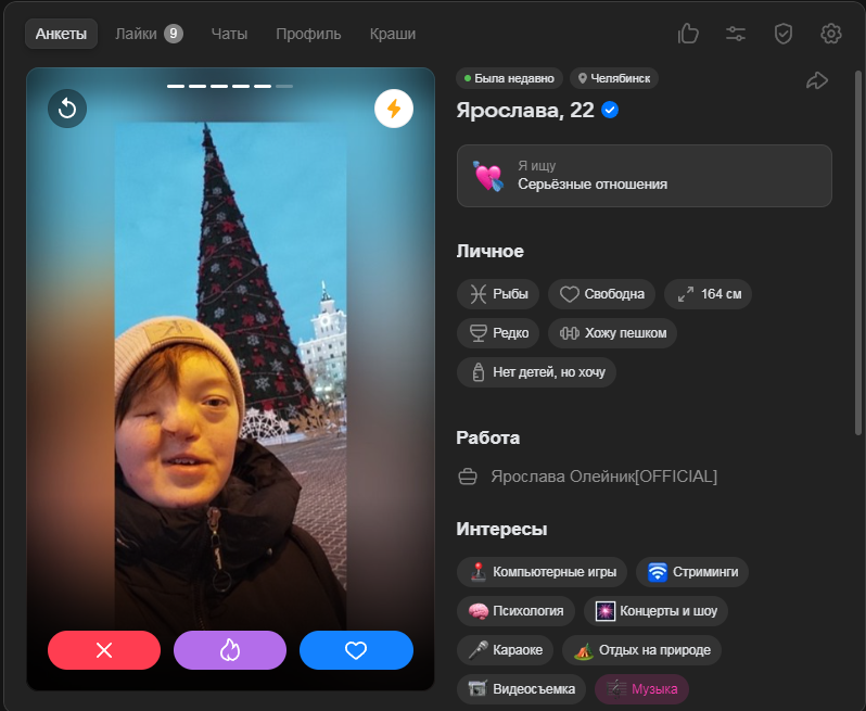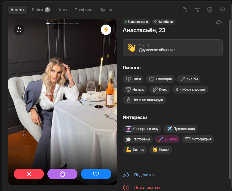 >>10313452 Хотя вот даже несмотря на все негативные факты, искренне не понимаю, почему столько дизлайков у него. Обычнотян вполне может его лайкнуть, конечно в процессе общения велик шанс будет, что сольет в пользу более красивого, но причин именно на стадии анкет его отметать со стороны тянок не вижу. Разве что обычные девушки окончательно съебались с сз и там сейчас только шлюхи с завышенными ожиданиями сидят.