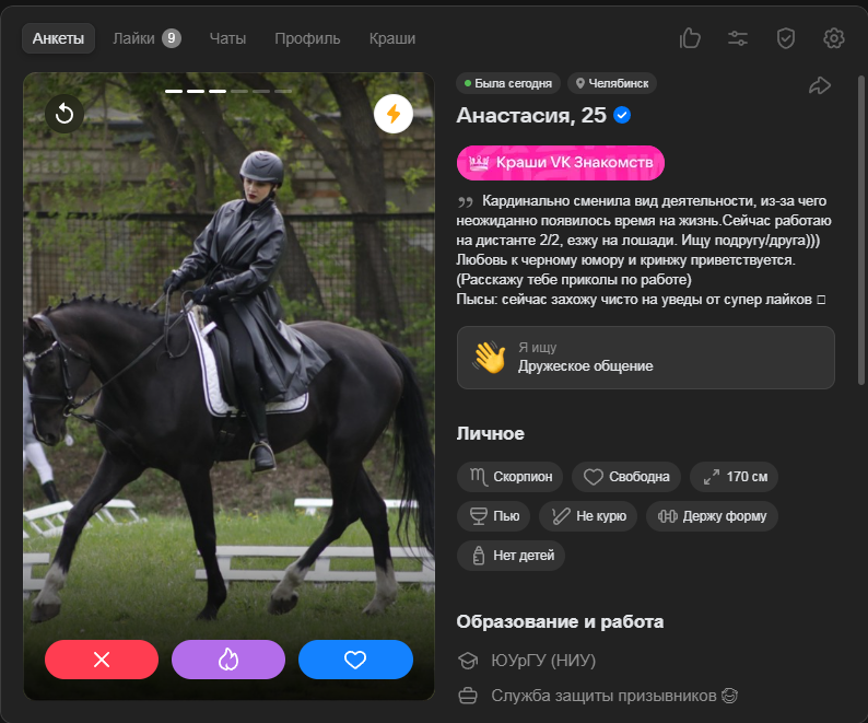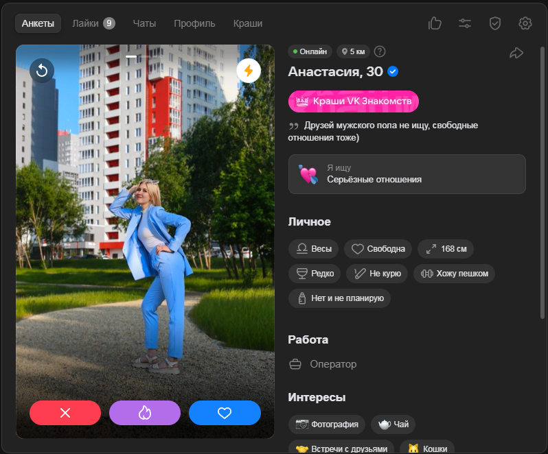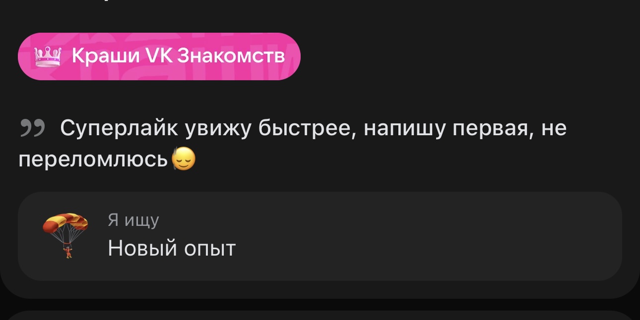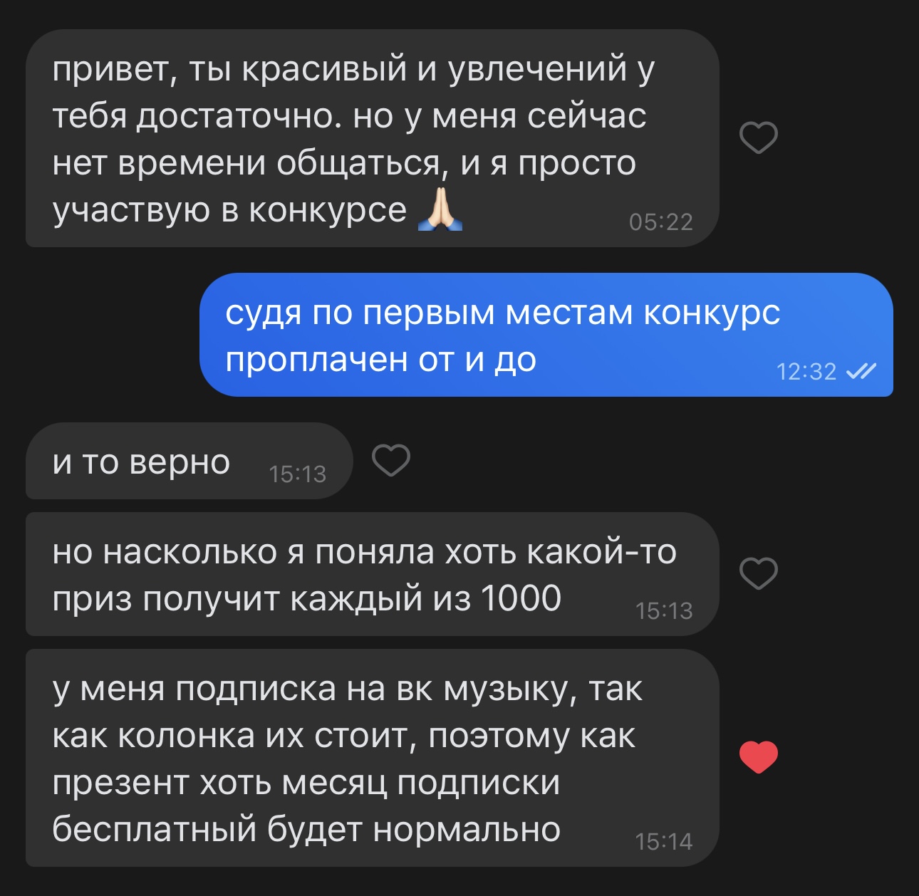 На вк знакомствах какой-то бум тупых шмар. Они запилили ебаный конкурс с призами за количество собранных лайков и теперь там сидит куча селедок, которые всеми возможными способами их фармят. Все это ради того, чтобы получить какую-то хуйню от вк типо подписки на месяц или сто ка за победу лол. При этом естественно они даже не собираются ни с кем общаться дольше пары сообщений в лучшем случае, тем более как-то взаимодействовать типо встреч и тд. Лайкают всех подряд в надежде получить ответку. Крч, если видите как выпрашивают суперлайк он считается за 5 обычных лайков в описании или даже мб просто участвуют в этой параше, то можете смело свайпать влево или даже репортить, хули нет. Раньше тянки с сз сосали с нас ресурсы в переносном смысле, теперь делают это буквально. За 300р удавятся цена подписки.