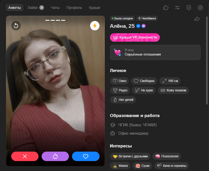 Конечно она, не тёплый клиент, как тян с сз, пиздит общается нормально реагирует на прикосновения, но чтобы ее соблазнить и трахнуть уйдёт несколько месяцев и свиданий 5-10 качественных встреч. За руку взять даёт, но потом приобнять? Куда нахуй я тебя 2 часа знаю. Нехватает адекватности ей, бывший пил бил и чмо теперь мне, ну или любому другому парню нужно доказывать что классный. Хочет прям очень серьёзных отношений. Так что на неё забил, может на танцы с ней схожу, а так буду дальше добывать людей на улицах, или где нибудь в заведениях