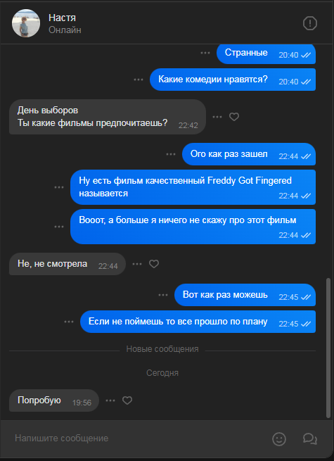 Общаюсь с тянкой третий день, и она чет совсем охуела, за сегодня не задала ни одного встречного вопроса, даже дефолтное «а ты?» в ответ на мои. Пишет странно, то много сообщений, то как будто на отъебись ответила, продолжает при этом иногда заходить на сз. Крч, учитывая все это, думаю можно особо не рассчитывать на нее. Прост сосет ресурс в поисках варика получше. Убавлю пожалуй активность в общении до редких ответов раз в час-два и завтра позову на похуй куда-нибудь ее, а там посмотрим да-да, нет-нет.