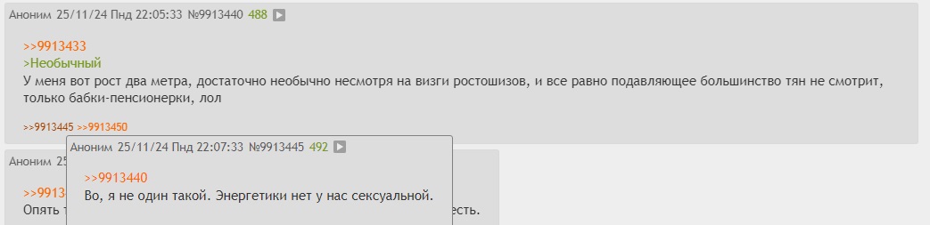 >>10313011 Я о том, что секс найти не проблема, имея хуй больше среднего. Отношения из-за роста может проблемно, но не невозможно. Опять же, ко мне подкатывали, причем я на ебло в лучшем случае лтн и ростом всего на пару см выше. Подкатывали не рандомтян, а с теми с кем в общих компаниях крутился. Может тащил той самой харизмой. Потому что, по ощущениям, при первом знакомстве я тянкам даже отвратен. Но что они в реальности думают не знаю, не спрашивал, может я неверно интерпретирую реальность. >дал ебало чуть выше среднего Ты определенно хтн, возможно даже чедлайт.