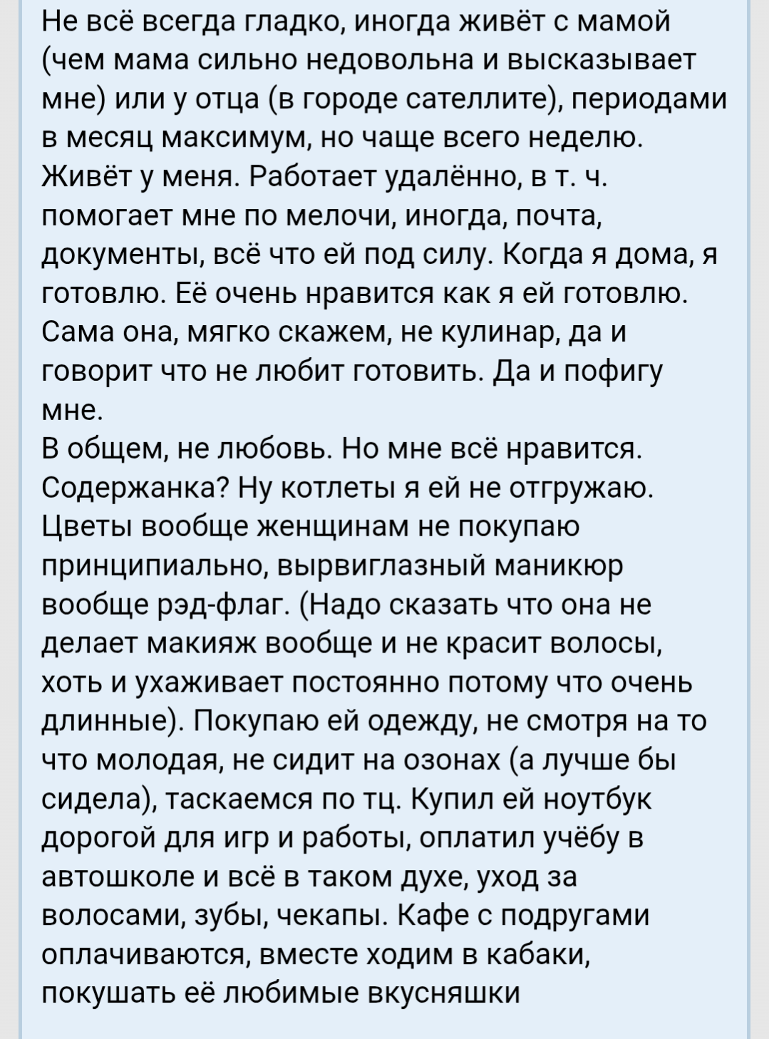 >>10313762 Запирали, отнимали еду, пиздили, вызвали ментов на меня, клали в дурку, не покупали одежду, не давали работать, жить, оскорбляли 24 на 7, плевали в ебало, травили еду, критиковали каждый пук, всегда вставали на сторону чужих, в любых конфликтах, при этом всём, требовали быть миллионером в 16. Плюс сексуальное насилие, вторжение в личную жизнь, тело. Вторжение в пространство личное, жёсткие диски, телефоны. Плюс они синячили. Плюс воровали. Жил на правах Маугли в квартире бабки. >>10313168
