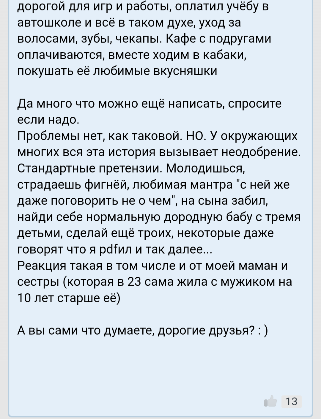 >>10314190 >что я все выдумал и не было такого. Да мне тоже говорили, хуле. Стандартное: "Я не помню" и глазки в пол. >Причем, ему самому тоже всю жизнь достается от нее, но нет, не разводится. Откуда столько терпения А вот потому и не разводится, что ему нравится терпеть. Есть такие люди, которые любят страдать, терпеть, по жизни ныть, быть в проблемах. Им сколько не помогай, сколько их не вытаскивай - они всё равно залезут в новую яму. >А ведь у него был выбор и он мог жениться на годной женщине Ну как видишь, мог бы, а он этого не сделал. Он сделал свой выбор, осознанный, женившись на твоей матери. Это его выбор - так пусть и дальше терпит.