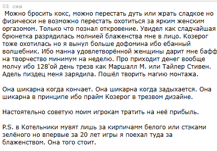 Я-то думал, ИТТ серьёзные господа заседают, которые эту жизнь прохавали и поняли, что пизда сейчас стоит 5-20 тысяч рублей в час. За эту скромную сумму ты будешь востребованный самец.