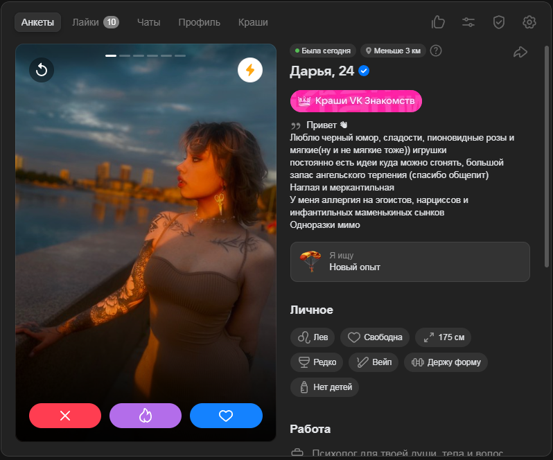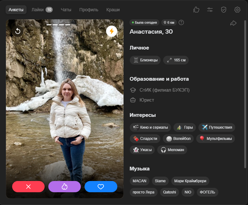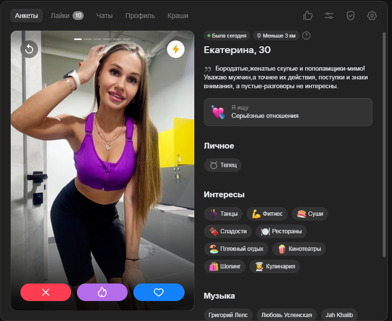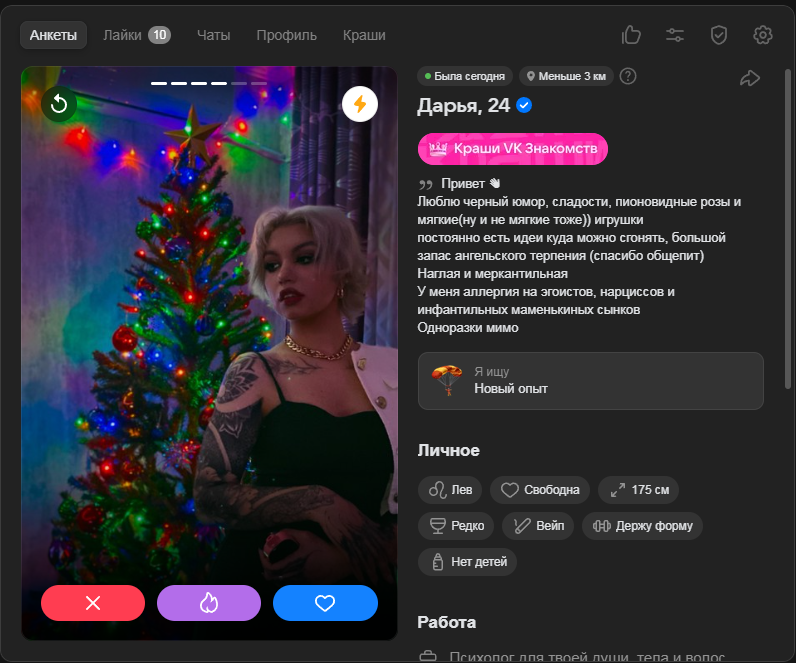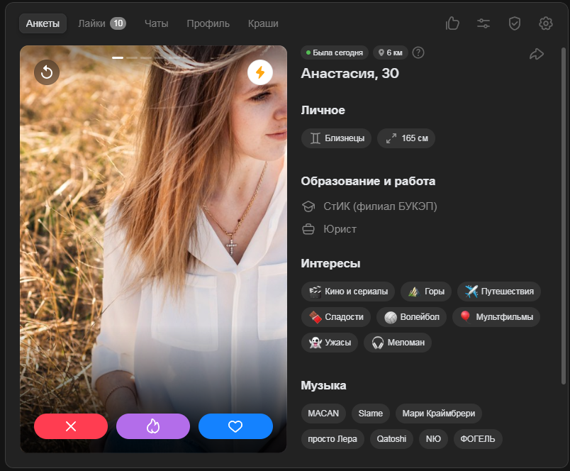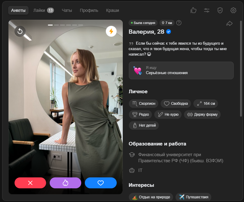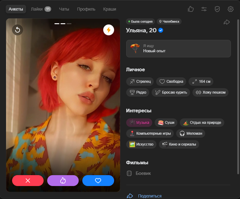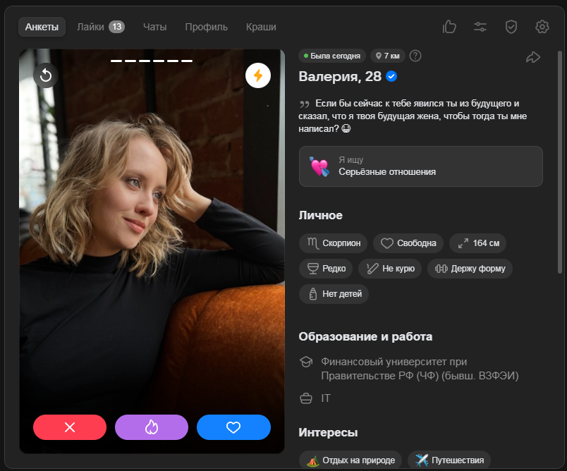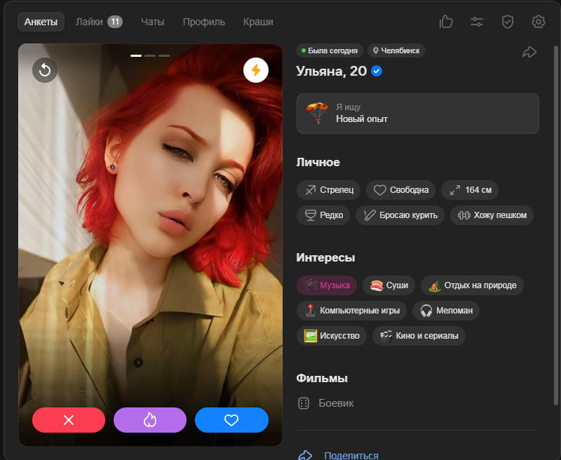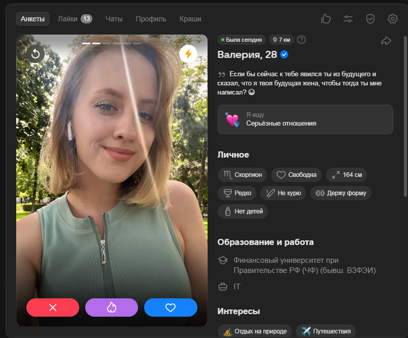 >>10323386 Ну тут я выше уже писал, что норм анкеты там вполне себе есть, но взаимных лайков в разы меньше, чем 2-3 года назад было в тиндере и вкшном дайвинчике.