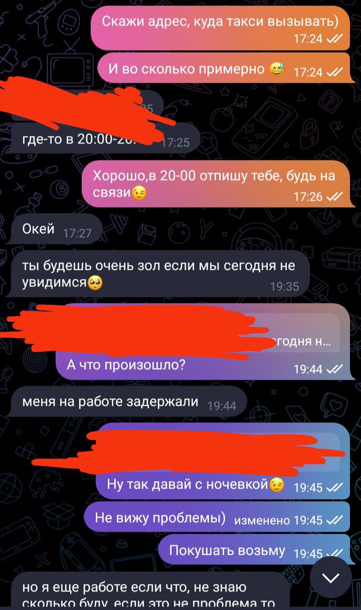 Это ,3 минутное шоу, несмей называть секс А то существо в которое ты хуй засунул, это не тян. >чел, где ты в переписе увидел намек на деньги Так ты ее трахал или переписывался ? По всему твоему рассказу все больше и больше подробностей Итог теперь такой: ты нарк, трахнул солевую спидозную шлюхю. Вот так те кто приезжают на такси и по поведению это шлюха называется, вдруг ты не знаешь. А созвон хорошая вещь вдруг там крокодил какой то и ты просто деньги проебал на шлюху