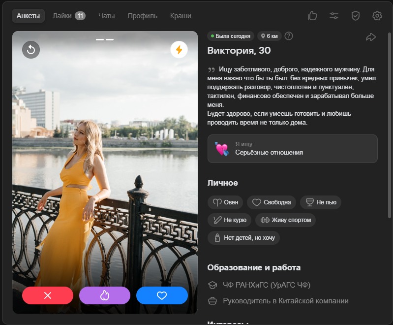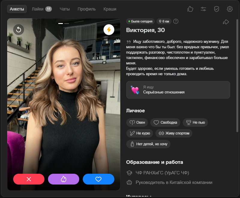 >>10316676 Лайкнула такая. В анкете буквально было написано "жадная тарелочница" и так далее. Я таких ни разу первым не лайкал, никогда на свидания не водил. Стало интересно ради опыта. Вытащил. Сразу бросилось в глаза, как она торопила пойти в бар, кек.