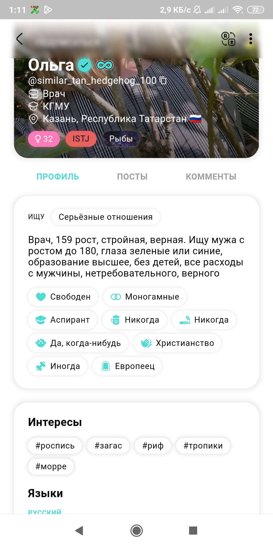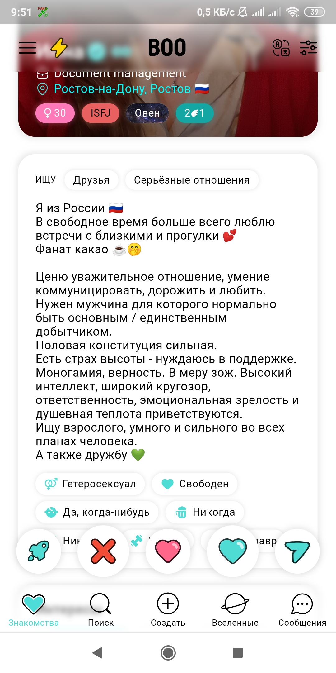 1. Ей нужна подружка с членом для развлечений по кафе , боулингам кадингам и т.д. 2. У нее уже есть парень для встреч, и она ищет Только серьезные отношения 3. ЕЕ недавно чпокнул и выбросил на мороз чедик, и теперь она ищет Только Серьезные отношения, и боится что с тобой история повторится 4. Она недавно закончила длинные отнощачи ищет подушку для нытья + пункт1.