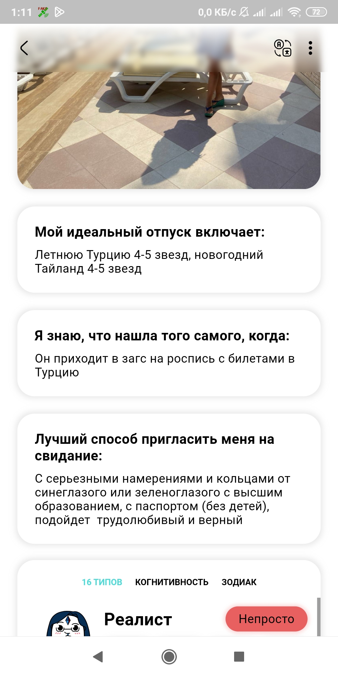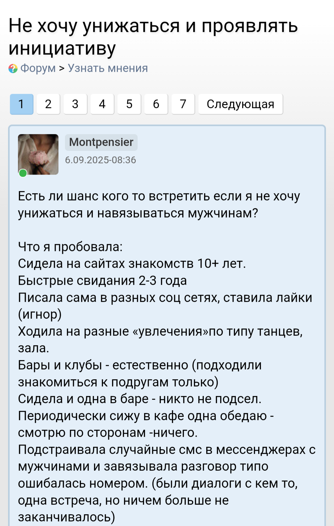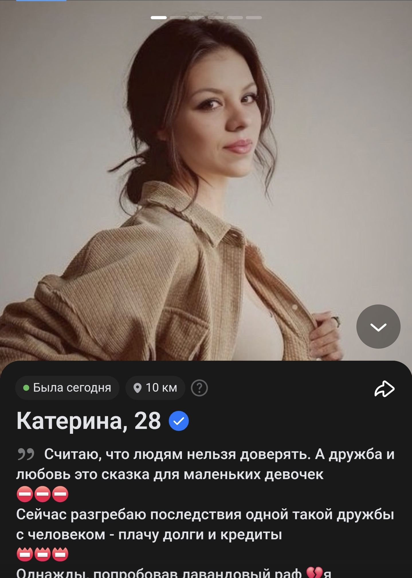 Был матч с инициативы бабы в бамбл, все ок, тг, встреча в вск потом она в отпуск в описании "серьузные отношения", особо ни на что не рассчитывал, так пох. Сегодня глянул ее анкету, а она уже на английском, новые фоточки, даты куда когда. а мы еще общаемся. Понимаю что никто никому ничего не должен на таком этапе, но блять.. просто вся суть ваших тяночек
