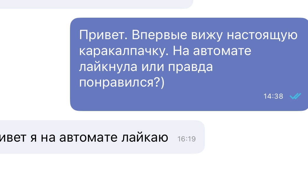 >потому что диалог идёт изначально и тян ебало не кривит. А тут я написал двоим, мне сказали что мне просто автоматом лайки поставили, охуеть просто 2 тянки слили ты уже истерику устроил? Мда. Вот видишь ты не нравишься тебе не пишут все просто Кидай скрины диалогов