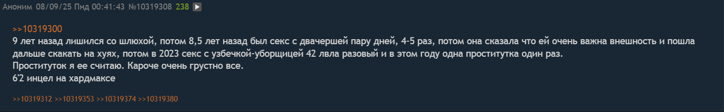 Вот типичный пример того как внешка влияет на жизненный опыт и мировоззрение. Ясен пень если ты безподбородочный лысеющий всратыш, но известный в определенных кругах , будешь бетабаксить. Можете ли вы себе представить Олега который дрожащими руками набирает ей смс: " дорогая, зарплату задерживают, прости"? 6'2 инцел на хардмаксе