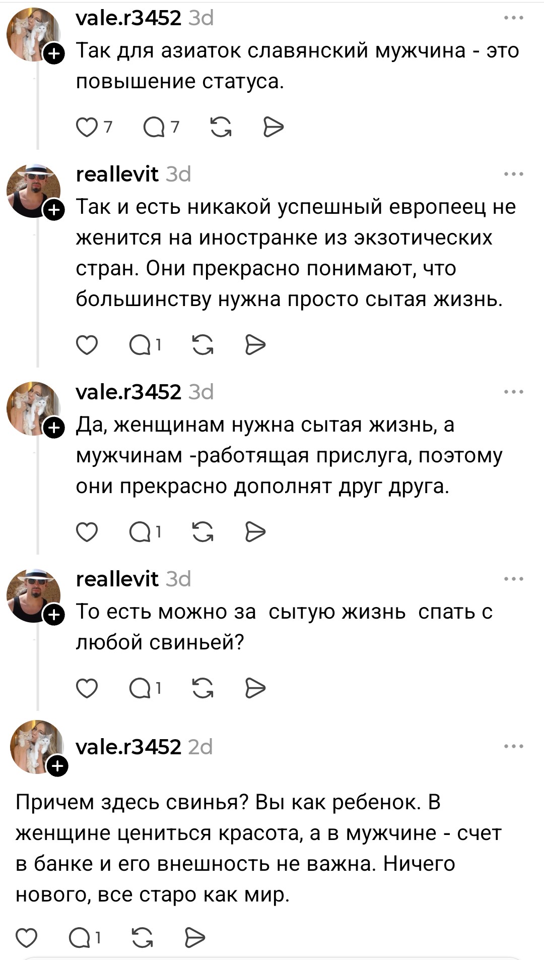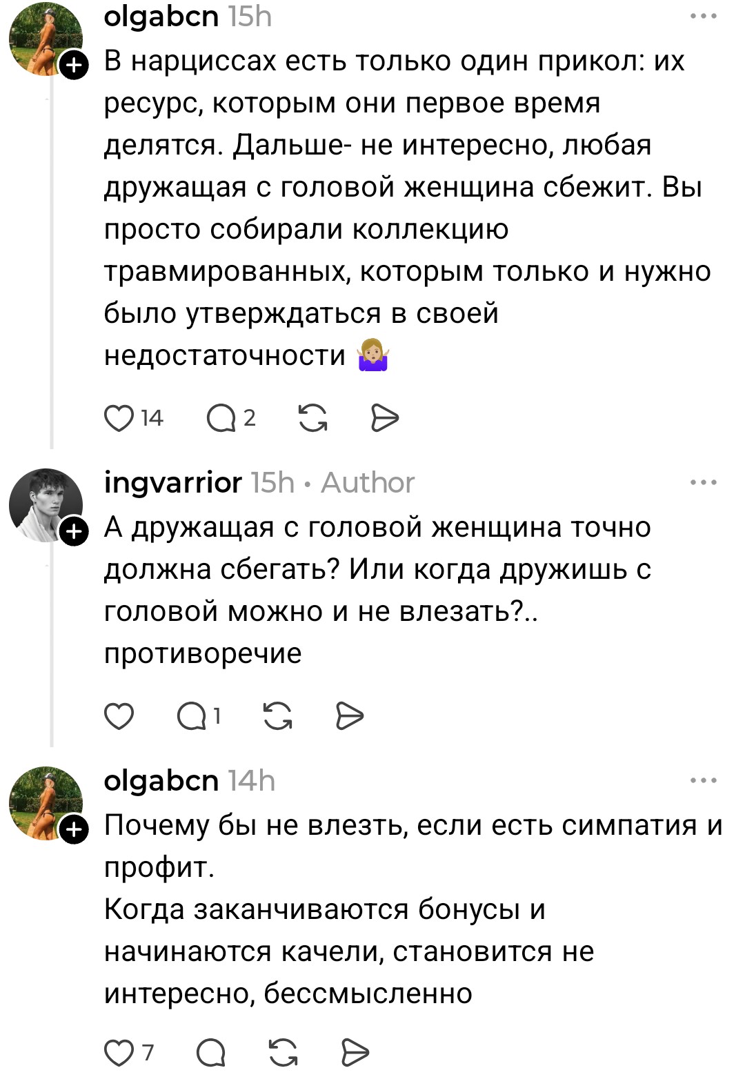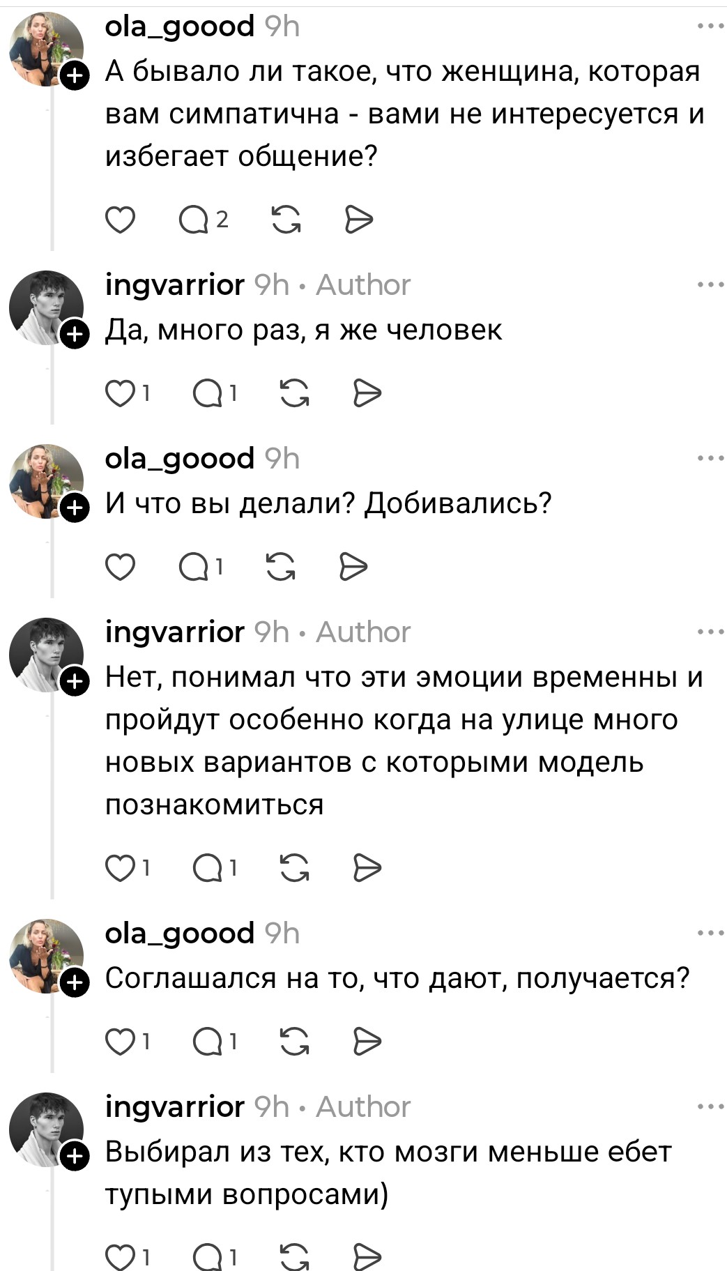 Катюха лютую базу выдала! Любовник для удовольствия, муж для продовольствия ☝️ А вот Аня лукавит. Она стала выбирать по другим критериям для отношений, а ебут ее все равно чеды. Ибо писечка только от них течет. Ебанный мир мразотный. 6'2 инцел на хардмаксе