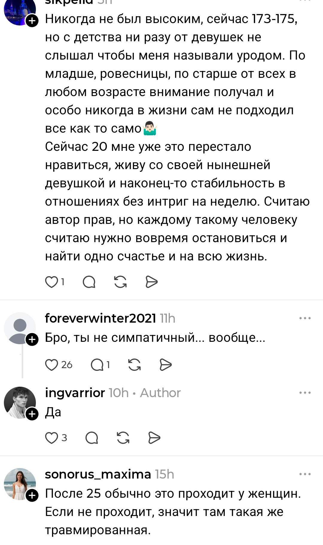 Напоминаю, что еще ни один "инцел" не написал здесь истинную причину отсутствия у него тян. Фразы типа : "я всего 178" звучат так же как , например, у меня темные волосы. Продолжайте вариться в своем соку..