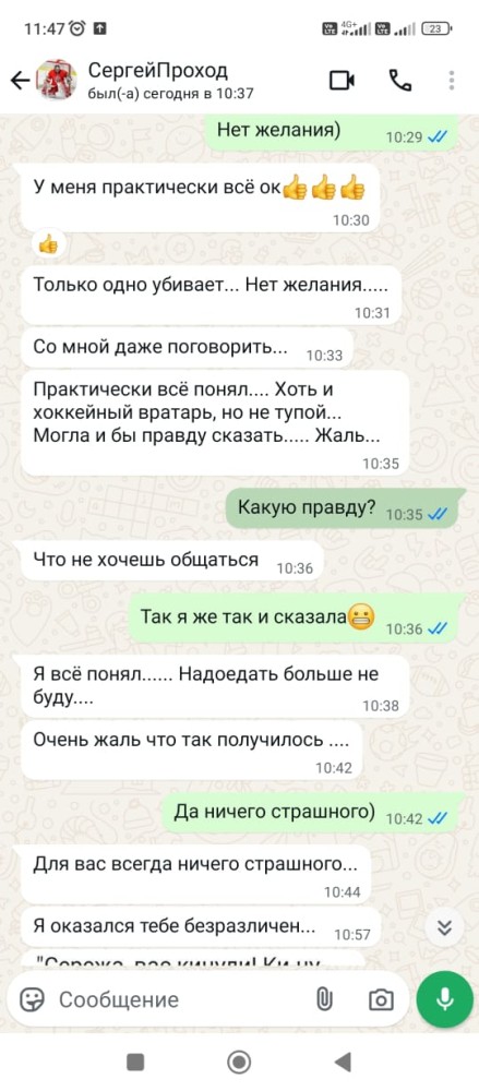В итоге, услышал, как она свалила со своего рабочего места, да ещё и проворовалась на 20к, что её спалили. И до этого мне писала, хотела денег занять, но я отмазался, что сам жду, когда получка капнет, тогда, если надо, займу, она больше не писала. Наверное, можно было тогда её пригласить к себе, купить какого-нибудь пива и впервые выебать кого-то, даже бы понравилось... Но надо ли оно так?