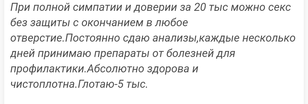 >>10325224 Я был в 2022, одна из первых моих шлюх. Прайс был такой же и уже тогда было экстремально дёшево. Анал действительно входит, все честно. Из подводных только то, что не красавица. Увидела, как заливаю мирик в уретру и строго сказала так не делать, если не было незащищённого контакта - за это спасибо, до этого заливал и было жжение. Ну и да, у них там секс-сборища из милф и скуфов проходят, к тг акку канал привязан, можешь чекнуть. Ещё она свои ЛЕКЦИИ туда заливает.
