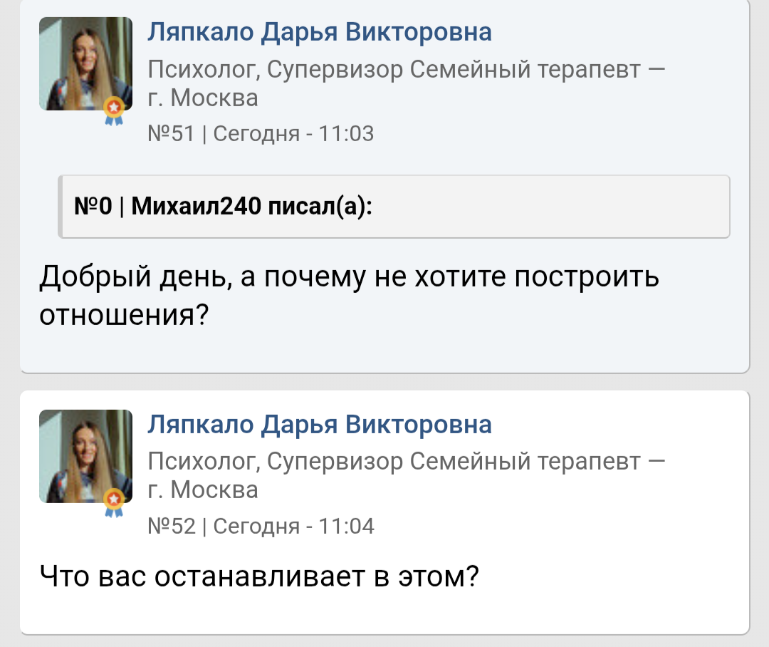 >>10328050 Ну так может они и правы? Может все проблемы в голове? Хотя стоп. Вы подкатывали и у вас тут уже у каждого луз-стрик из 100+ отказов? Я вот просто никогда ни к одной. Ноль отказов - потому что ноль попыток, знаю что с дерьмом смешают.А может и зря, может и не смешают. >>10328059 Ну, то что поход к проститутке сам по себе ничем не поможет - в этом они правы. Вкусно, да, но нормисом тебя это не сделает.