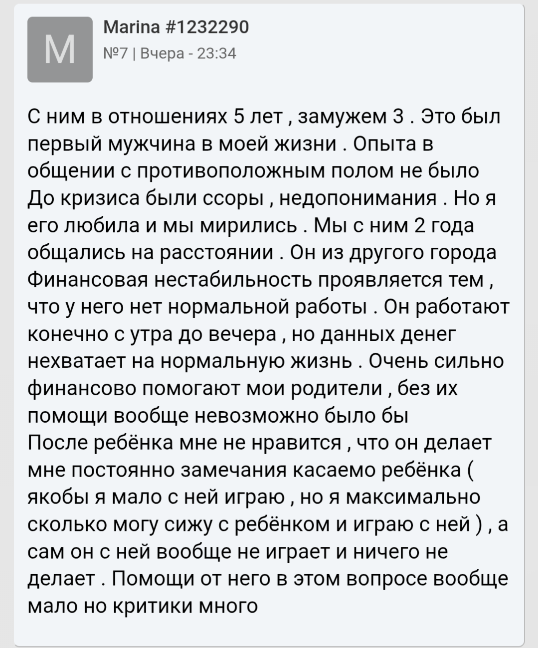 >>10329050 На прошлой работе была Катька. Первые отношения с будущим мужем у которого еще и ребенок от прошлой, лол. Родила ему двоих, чтобы на гойду не забрали, денег стало не хватать и муж пошел в росгвардию, Катька переехала в Тверь к мамке, так как аренду не тянули. У мужа работа сами понимаете, не продохнуть и выходных мало, да еще и кататься. Охладела к нему и написала мне, что совершила ошибку и я был бы лучшим выбором.