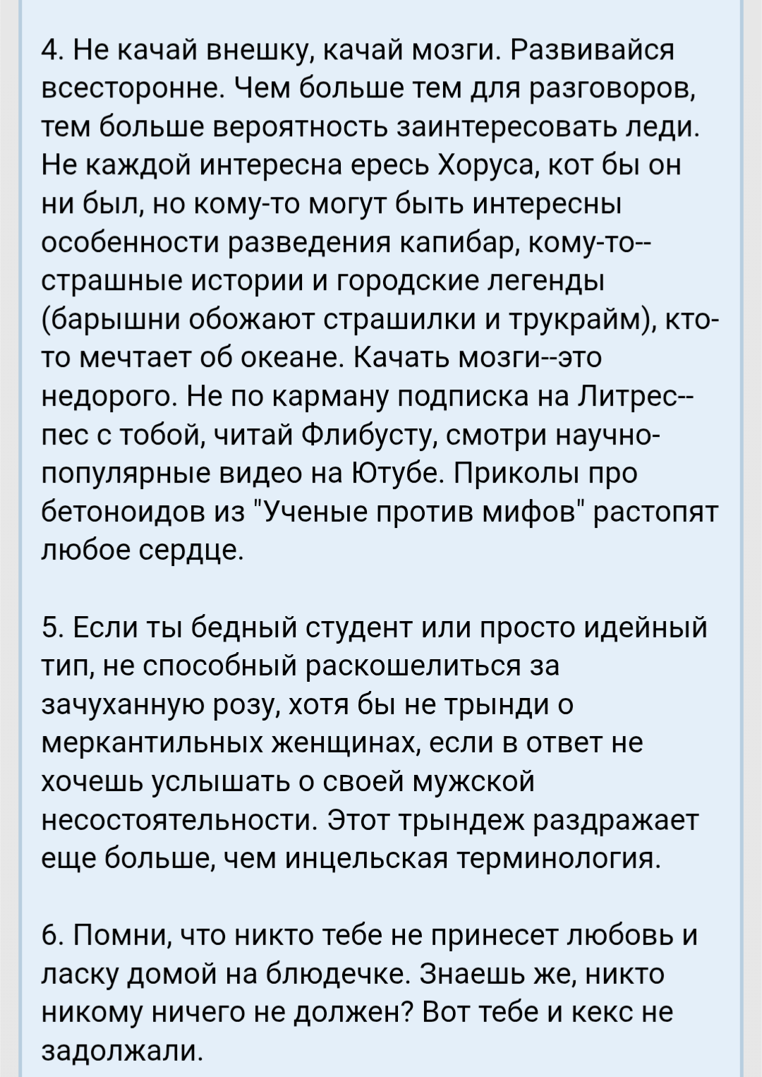 Короче я вот задумался (с перепою, разные крамольные мысли в голову лезут). А может вся эта теория инцелов - хуйня? Я вот сейчас играл в свою дрочильню, фармил, ну и в фоне СуперСуса слушал. Ну и там Сусян базарил с Лафой о чём то, и на фоне Лафы жiнка его постоянно чота орала, пьяная, чота забыл как её зовут. Ну так вот - она привлекала к себе внимание, она хотела чтоб на неё обратили внимание, чтоб поговорили с ней. И я вот задумался - тянкам же тоже хочется внимания. Пиздец. И иногда даже от инцелов. Как бы странно это ни звучало. Вообще тема инцелов - штука такая скользкая. Большинство из них - абсолютно нормальные внешне парни. Ну бывают конечно совсем уёбища, но это редкость. Да даже уёбища могут компенсировать внешку деньгами. И умение общаться с девушками, разговаривать с ними и вести диалог - это тоже навык который нужно тренировать и учиться. Инцелы это как правило не умеют и сходу наваливают кринжа. Ко мне вот множество раз подходили старые знакомые, спрашивал - за жену и детей, а что я отвечу? То бишь у посторонних людей складывалось впечатление обо мне - как о блять нормальном обычном человеке, как все. Так ладно - начинаю им затирать что бабам нравятся только красавчики и богатые - они начинают крутить пальцем у виска и называть долбоёбом. У них в голове понятие инцельства не укладывается. А то что все бабы бытовые проститутки - ну, даже обыватели это прекрасно понимают, но соглашаются на эти заведомо не выгодные правила игры априори. Да, бабы это проститутки, и от этого никуда не уйти. Вообще, я так заметил что всех парней можно разделить на 3 условные категории. Это альфачи - их дай Бога процентов 5, за ними бабы сами в очередь выстраиваются, и трахаются они около-бесплатно. 42,5% - бетабаксеры, это инцелы которые платят. 42,5 - собственно инцелы, платить они не хотят, им это западло.