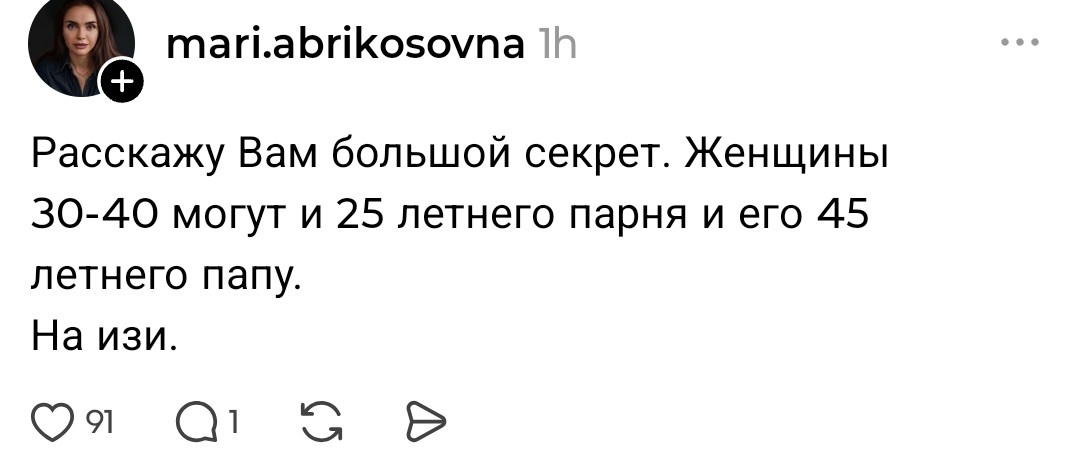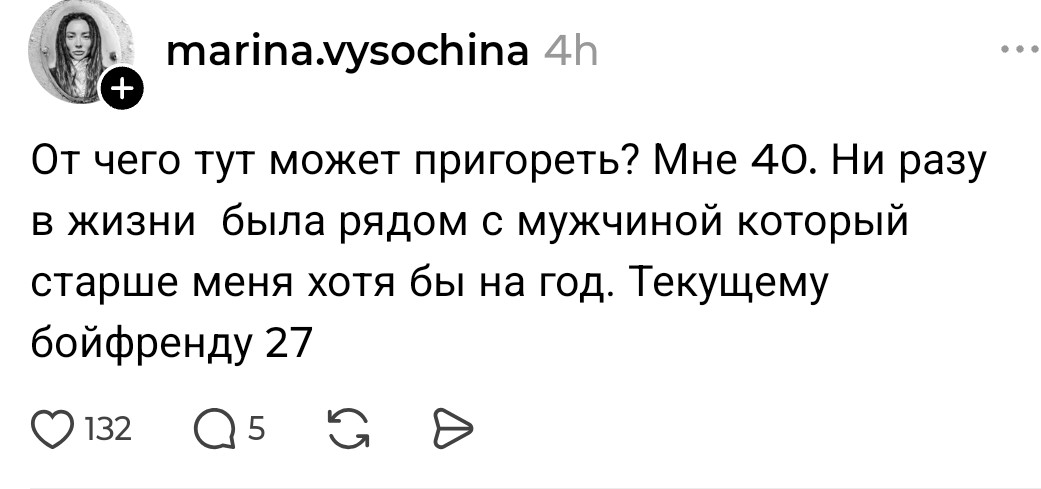 >>10335431 Мне интересно очень. Скажите пожалуйста, а вот если как здесь девушки за 40 или ближе к 40, а парню там едва 25, то какие требования к парню выдвигают такие женщины? Как мне кажется, у такого парня ещё толком нихуя нет ну или максимум какая-нибудь не очень машина. Большие деньги они вряд ли поднимают и будут ли поднимать вообще. Чем они цепляют этих взрослых девушек? Вы тут про статус пиздите и что требования у взрослых женщин выше, но почему они тогда выбирают молодых с разницей почти 20 лет у которых вряд ли что-то есть?