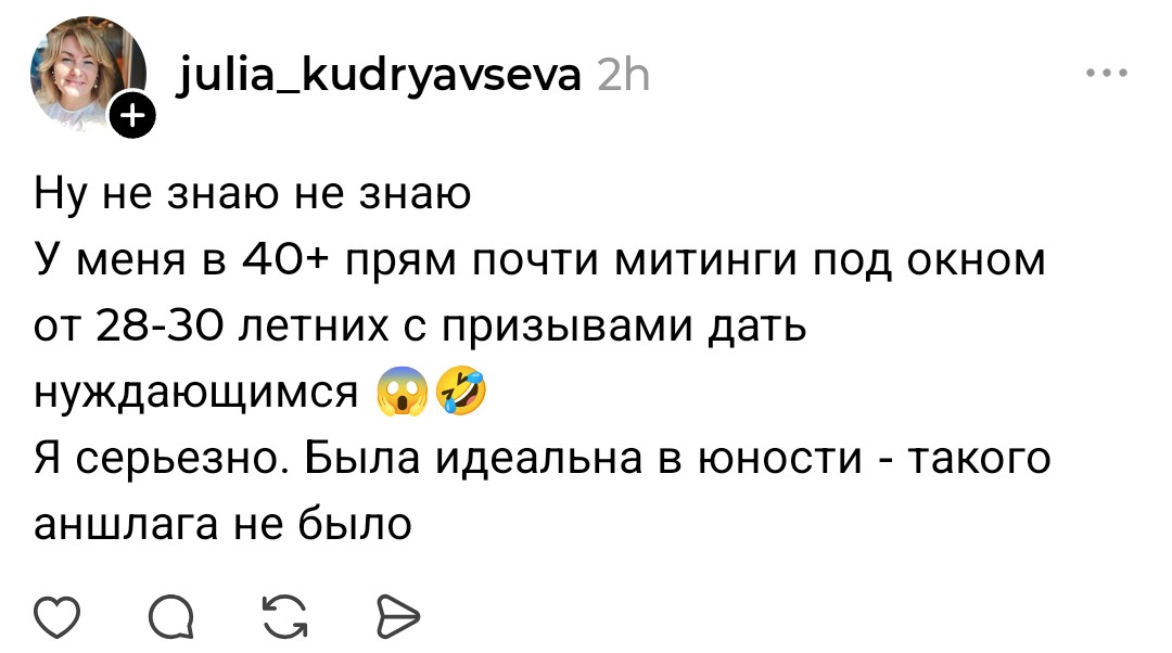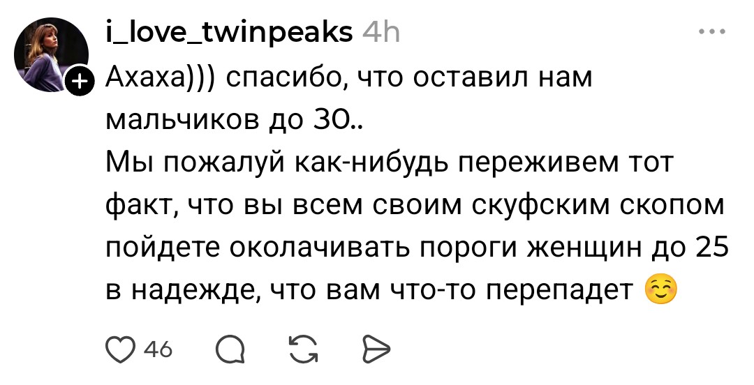 >«Я считаю, что проблема, о которой говорят демографы, — это проблема мужчин. Этот инфантилизм мужчин меня поражает. Я нормальных мужиков вижу в основном на СВО, остальные какие-то мамкины сюсюндры. Ходят в шортиках и мечтают о Playstation в 30 лет. Зачем всё это? Любая женщина хочет видеть рядом с собой надёжного мужика. А не какого-то похотливого самца, который по пятницам нажирается в баре и строит глазки какой-то кривоногой. Практически любая женщина хочет семью, а мужики начинают заигрываться, они маминькины сыночки».