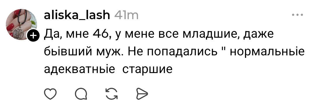 >>10336505 Окей: в промежутке но 30 до 40 меня тоже никто не выбирал. Одна женщина была старше меня на 6 лет с двумя детьми, которая была уверенна, что я ещё радоваться должен, но я тактично отказался, чем вызвал лютое возмущение. Я имел в виду, когда тебе и 30 нет, а к тебе подкатывает женщина лет 40-45. Мне, в целом, такого не надо было никогда, мне бы и сверстницы хватило, но и с ними тоже не очень было. Вот так жизнь и прошла