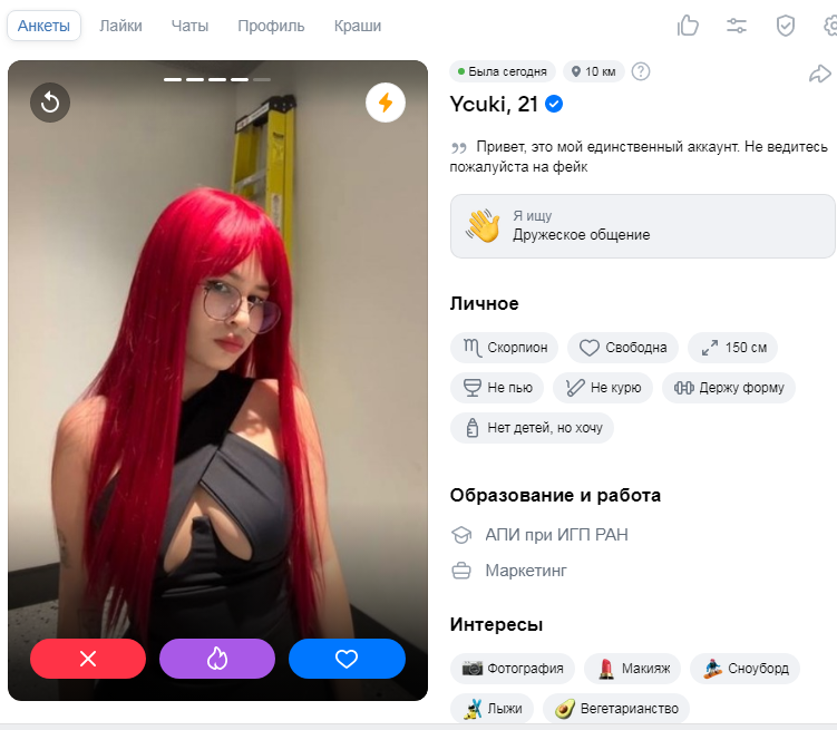 >>10333489 ты необучаемый чтоли?я тебе 1000 раз пишу:чувак,внешностью торговца из вьетнамис ростом 167 см,с одной совершенно обычной фоткой в анкете ,лутает лайки как не в себя и все с ним идут на диалог.