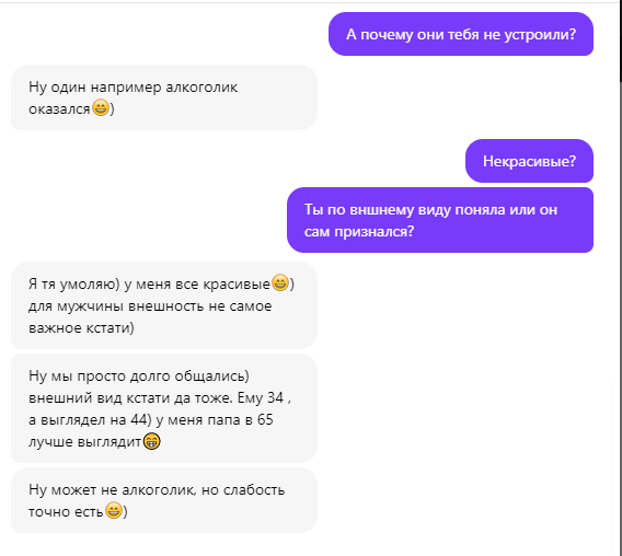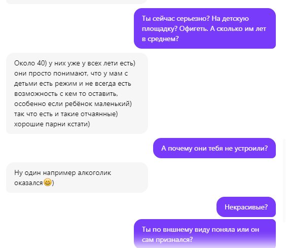 А если тебя душат события в жизни другого человека, то зачем с ним близком общаться? Если нет возможности поддерживать с человеком долгий диалог, то что изменится-то на личной встрече? Я искала общения, он тоже, и мы эту потребность друг друга удовлетворяли. А потом уже встреча, гормоны и последующие события в виде отношачей. Или ты думаешь, что если душат разговоры в переписке, то в жизни это окажется совершенно другой человек? Вообще не факт.