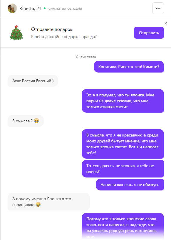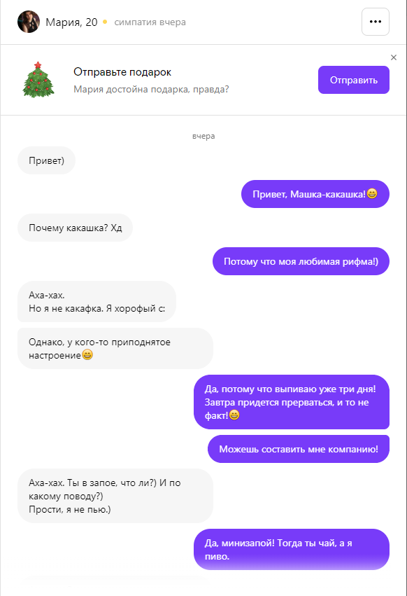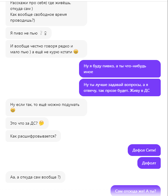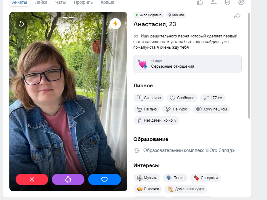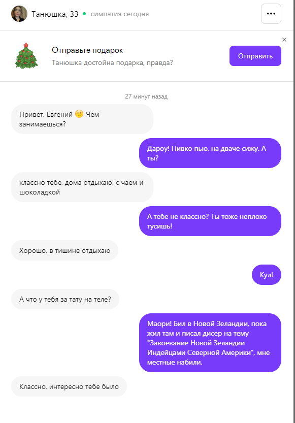 Вкину своих старых скринов со свей реальной анкеты, чтоб на контрасте с переписками с фейка Татарина Зимой не помню какого года уже, пытался найти себе кого-нибудь, чтоб покататься на коньках. Так никакого не нашел за всю зиму. Написал 250 девушкам и женщинам, большая часть не ответила, а те немногие, что ответили не согласились