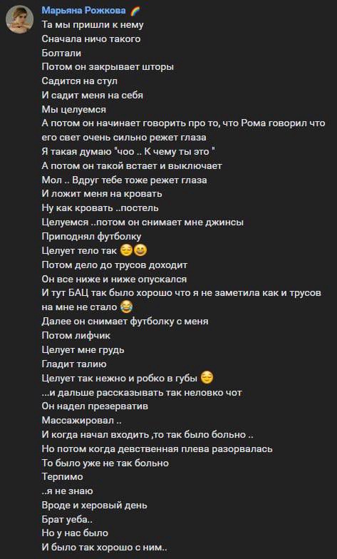 1. Соседка Мы жили в одном подъезде, я часто провожал ее со школы до примерно 7-8 класса. Ну и всё на этом. 2. Другая одноклассница в 5-6 классе пришла ко мне домой и мы типа боролись на кровати, я видел ее трусы через колготки. То есть она разделась что ли? Плохо помню. 3. Третья одноклассница в 4-5 классе часто завтракала у меня дома, чет вообще не помню как так вышло. То есть она сначала заходила за мной, мы ели, потом шли в школу? Она жила далеко от школы. 4. В 16 лет я попал в больницу. Девка старше меня хотела чтобы я спал с ней в ее кровати? Еще я трогал ее грудь через одежду, еще она заставила меня поцеловать ее в щеку. Еще она забирала у меня телефон, и я боролся чтобы отдала. 5. Как-то пошел с бабушкой в магаз типа пятерочки, там меня увидела одна тян, работавшая там. Потом оказывается спросила у бабушки про меня. Бабушка ей сказала, что я чисто по славянским тянкам. Тян была казашкой. 6. На работе познакомился с малолеткой. Как-то под НГ эта хуйня начала мне названивать. Неделю-две мы общались после работы по несколько часов, и по кд виделись на работе. То есть после работы я шел домой и пиздел с ней. Просто мне это было в новинку, я не думал что могу кому-то понравиться даже в роли клоуна, не осуждайте.
