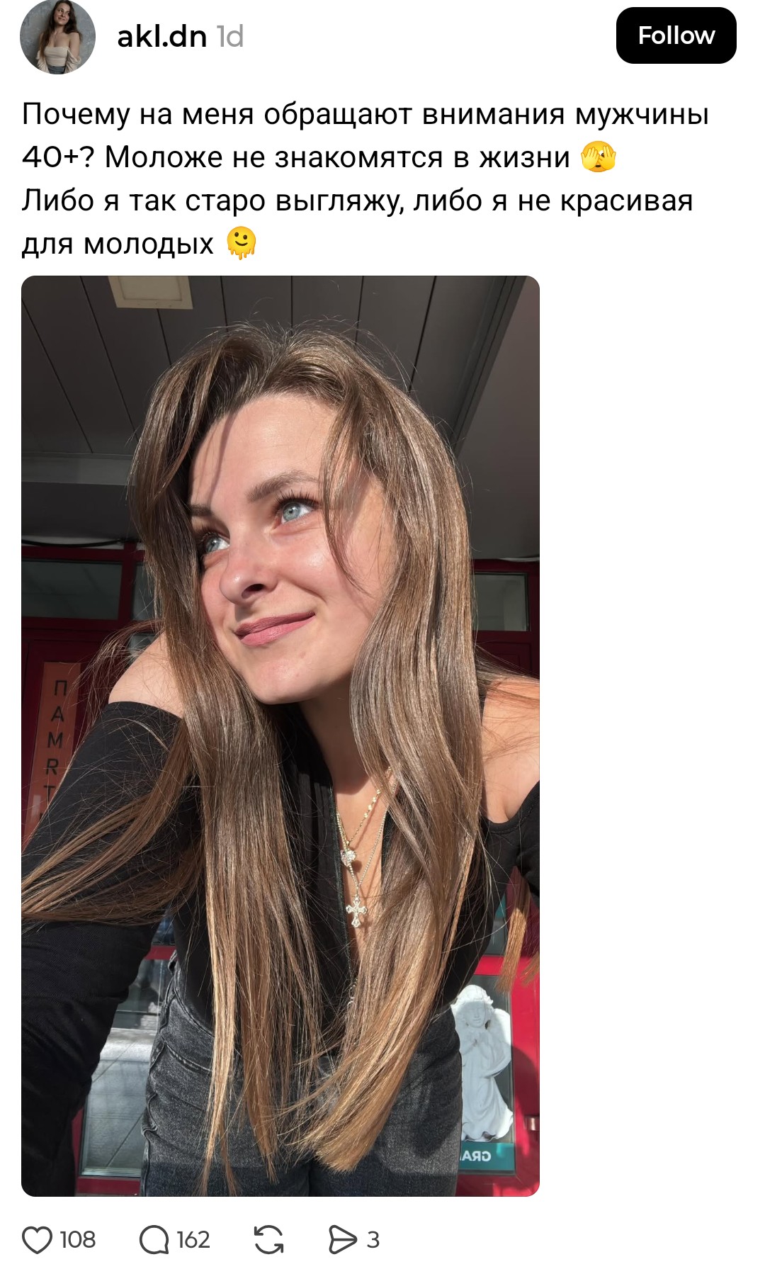 >>10337483 Мне кажется, сейчас у всех парней возврата 16- 50 самые востребованные девушки как раз 27-33, в этом возрасте шикарно выглядят, как 20 летние в нулевые. Ещё и реализованные, с деньгами Часть из них в отношениях/браке и мамы, часть - те самые эскортницы, инфлюенсерши, блоггеры инфоцыганки, модели одежды на вб из инсты. Либо, как тут говорят, невзрачные скромные девушки с комплексом неполноценности, возможно. Которые ещё продолжают самореализацию. Но самый хоррор у 40+, почему-то все женщины 40 лет злые, часто такое наблюдаю А я пишу, потому что среди своих ровесниц также вижу проблему, что мало нормальных, без эмоциональных качелей, или страхов, фобий, например, ревности и нарушении личных границ Тян 19