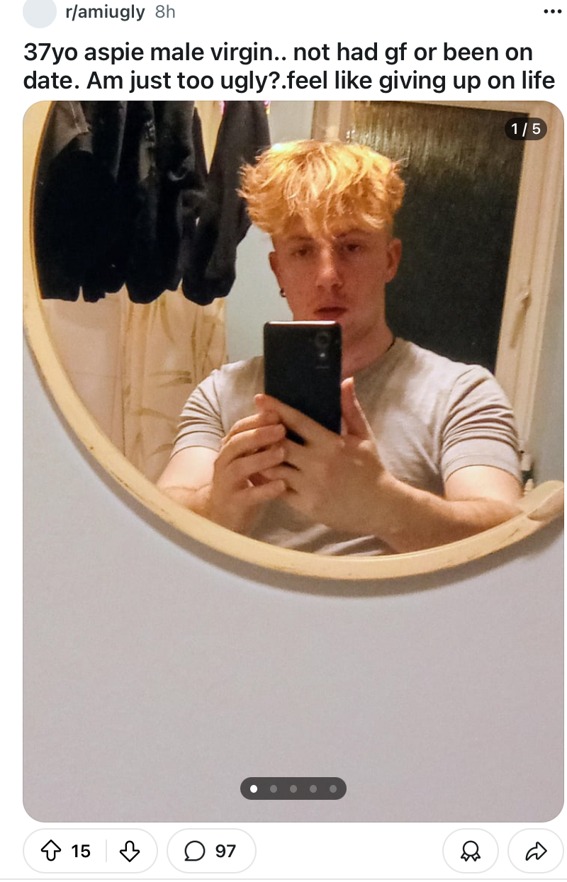 В тред приглашаются инцелы. Если ты выбил комбо по этим пунктам: 1. Рост ниже 175 см; 2.1 Член менее 13 см. по длине; 2.2 Член менее 11 см. по обхвату; 3. Внешность хуже, чем 5/10; 4. Физические и/или психические болезни; 5. Норвуд; (лысеющие) 6. Короткие руки; 7. Дистрофия или ожирение; 8. Грушевидная фигура; 9. Проблемная кожа; 10. Опухшесть лица; 11. Глаза жертвы, косоглазие; 12. Дефекты речи, То добро пожаловать на наш раут! Тут мы обсуждаем бытие некрасивых кунов, поддерживаем друг друга, желаем рака мозга симпам. Аминь.
