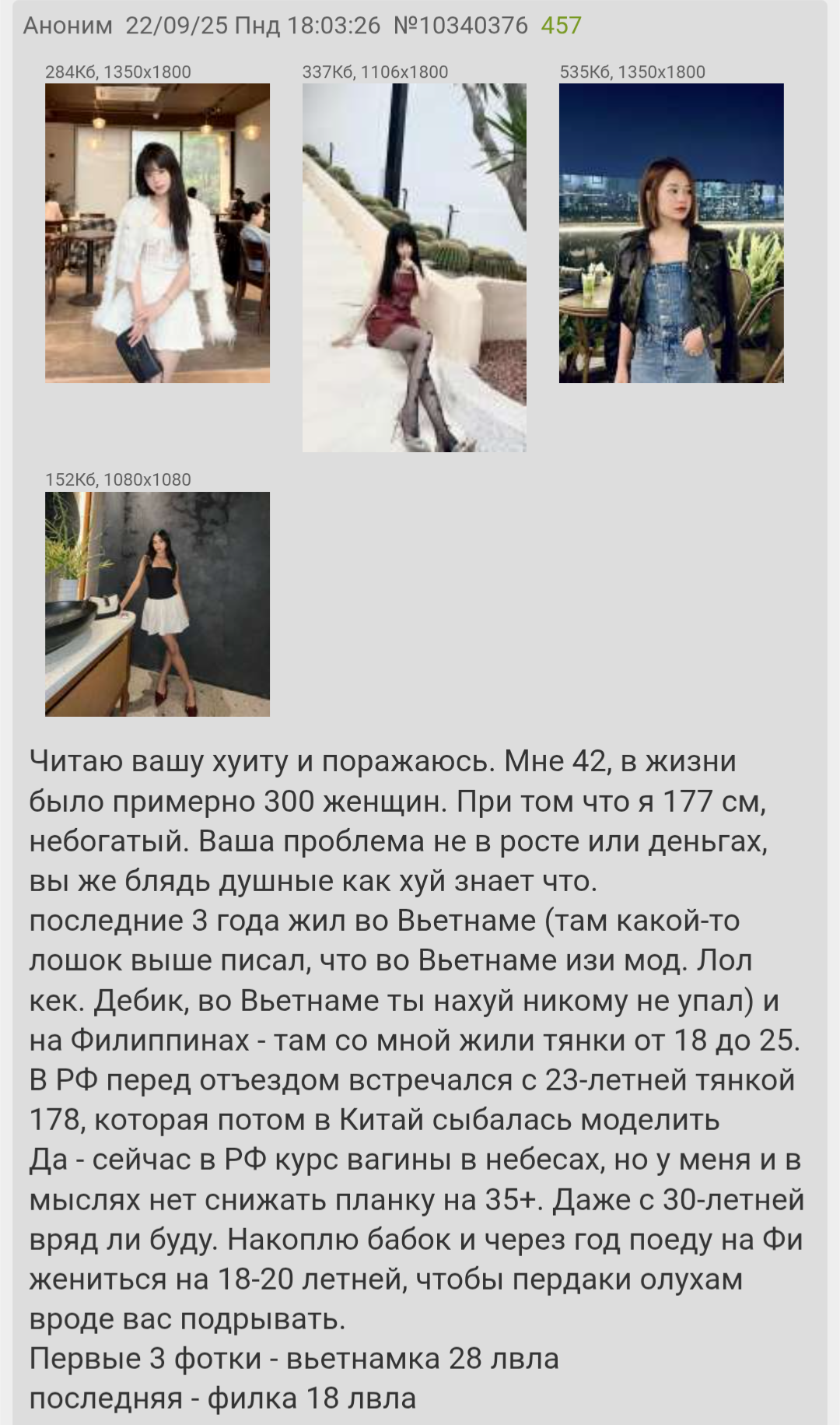 >>10340915 Ну вот я был тру инцелом и хикканом, с 15 лет учился в суворовском, там где были одни куны, потом поступил на специальность где были одни куны, соответственно с 15 до 21 года общения с тянками не имел. В 22 когда все закончил совершенно случайно удалось вписаться в компанию сходку молодых людей типа нефоров хипстеров, причем она была с нуля и мне было легко вкатиться потому что там никто никого не знал и все пришли знакомиться с нуля. Там в итоге появилась тян которая сама проявляла ко мне интерес и в итоге соблазнила, я ей сразу предложил отношач и жить вместе, она согласилась. Потом расстались спустя пару лет так как у ее родителей были проблемы и она уехала к ним и не вернулась, осталась с мамой и наши отношения сошли на нет. С тех пор я один и у меня не получилось завести отношения, один раз познакомился с всратоватой тян кассиршей, она соглашалась на отношач со мной, но у нее было неприятное лицо и она была тупая+брухля, после пары встреч у меня я не загостил и дропнул когда она начала намекать что хочет ходить по ресторанам. Потом познакомился с очень красивой тян, с которой все интересы совпадали и она удаляла мне внимание и даже помогала, спустя 3 недели признался ей что люблю ее и предложил отношач, она согласилась но спустя 2 недели написала мне чтобы я не искал с ней встречи и заблокировала меня. Через месяц нашел себе очень приличную тян 187/55 , начал сразу с ней общаться в стиле люблю/женюсь, было 3 свидания в течении недели, потом она позвала меня к себе и я ее трахнул. Но буквально через пару дней у нас случился разлад и на ее день рождения я ее оскорбил, но мне удалось с ней помириться и ещё через 2 недели она меня дропнула и закинула в ЧС, сказала я эгоист и она не чувствует себя со мной в безопасности, что я долбоеб и она меня отпиздит палкой если увидит. По этим двум последним тян я все ещё пиздострадаю. К слову, в тот же день когда я познакомился с тян 187/55 я познакомился на том же сайте с другой тян всего 18 лвл которая была со схожими параметрами 180 на 50. Но она не согласилась так быстро на свидание как та а потом пропала с радаров, но как только я был дропнут начала писать мне, но до встречи так и не дошло в ближайшее время, я сидел месяц пиздострадал пока она не написала мне что у меня на районе и хочет встретиться. Я конечно сразу согласился и у меня с ней было самое длительно свидание около 8 часов к ряду. Но в итоге она написала мне что типа я ей не подхожу потому что уже старый и все такое. Но ещё пару раз приезжала на встречи без секса, а потом написала что хочет себе лампового купюнчика буквально на пару лет старше для которого будет целой вселенной, пускай даже будет ниже ее и закинула меня в ЧС. Я был у нее в ЧС до августа где то, потом увидел что она меня убрала из ЧС, но я ей не писал ещё. Но по ней я не пиздострадал как по двум предыдущим. Сейчас общаюсь с одной ламповой тяночкой которая рассказывает мне что никогда не имела отношача, было уже с ней наверное 8 встреч, виделись 2 раза в неделю стабильно. Сильно стараюсь не наглеть как с предыдущими неудачами и возлагаю на нее последнюю надежду так как она мне подходит и. Бы даже женился на ней и создал семью потому что она мне кажется такой невинной, сказала алкоголь попробовала впервые в 22 года и никогда не была в отношениях, работает на высокооплачиваемой работе. Такие дела