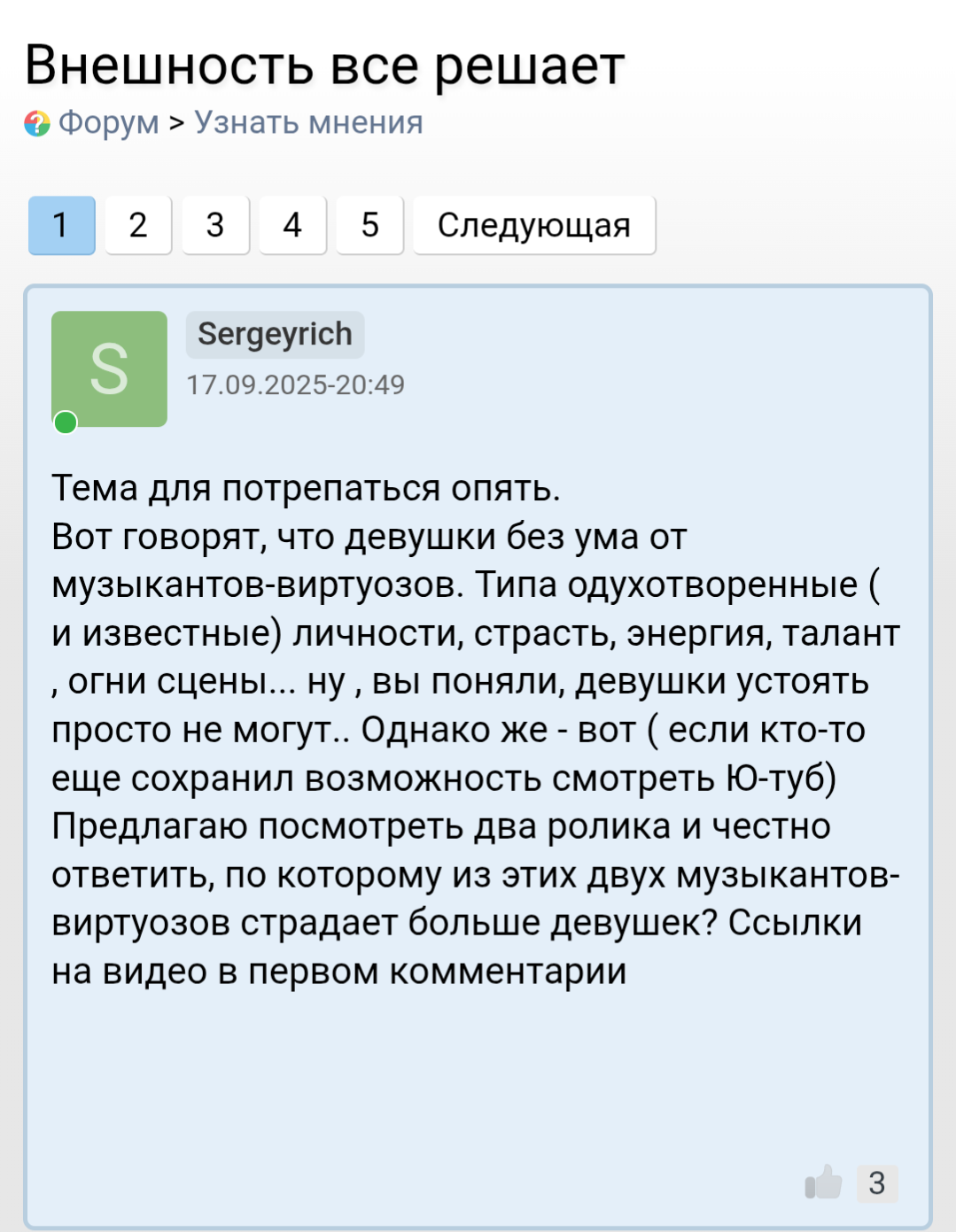 Мне тян никогда не пишут только мужчины. Думаю даже объяснять не нужно что сейчас на рынке биоотношений происходит? Вот буквально пару дней назад фотку прокоментили и не одного лайка или диалога в которым бы тня была заинтересована именно рассматривая как партнёра с этой фоткой. Это реально предел луксмакса я уже темболее старею. Мы тут по сути мазохизмом занимаемся в треде ибо не подкатывали в 15 не будут и в 30. Гранитная база не иначе.