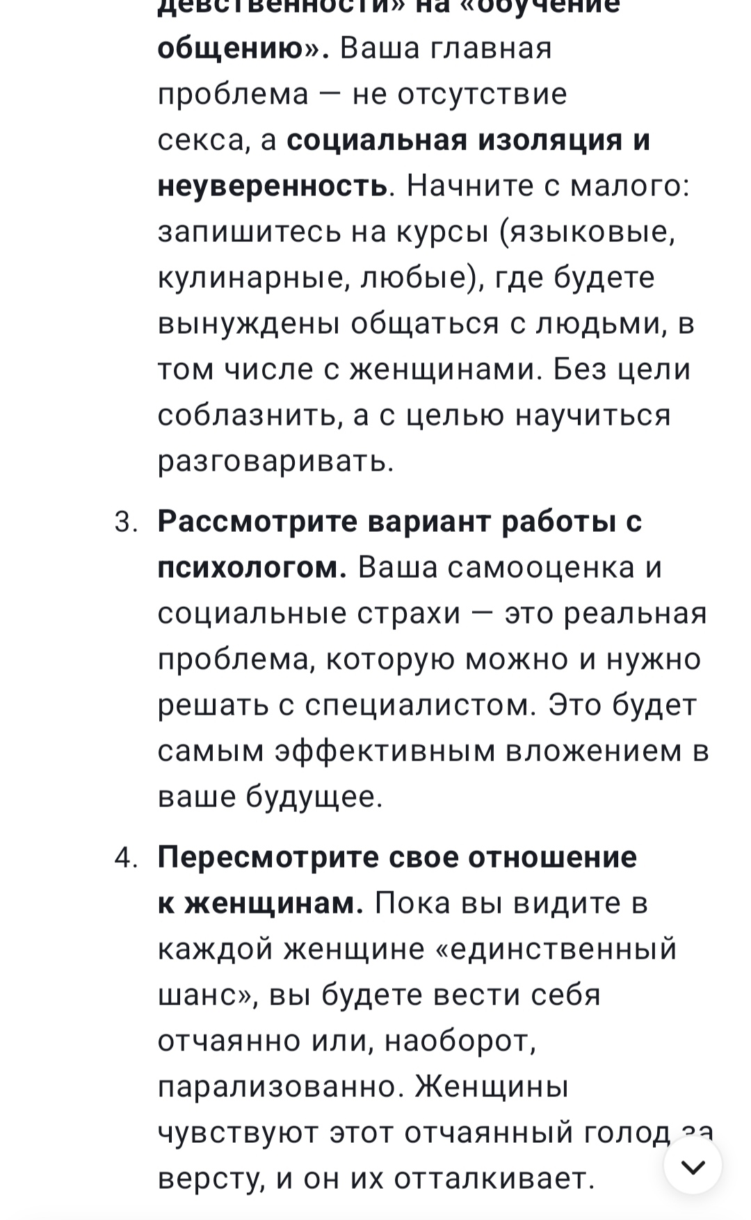 >>10341171 Годные советы, все по делу пишет. Потому что большинство инцелов здесь - обычные парни с заниженной самооценкой. Есть конечно те, у кого реальные проблемы с внешкой из за физиологических дефектов, но их на самом деле не так много. Остальным нужно делать именно так, как сказал дипсик