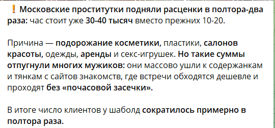 20-30к в час для Москвы, где какой-нибудь плиточник лутает по 500к в месяц, это недорого. Тем более, цены на всё выросли очень сильно. У девчонок очень много денег уходит на поддержание себя в форме. Один только уход за волосами это 100-150к в месяц. Не забываем про поддержание анкет на ИС/ашу, это 200-300к в месяц потому что самой этим всем заниматься некогда зачастую девчонкам.