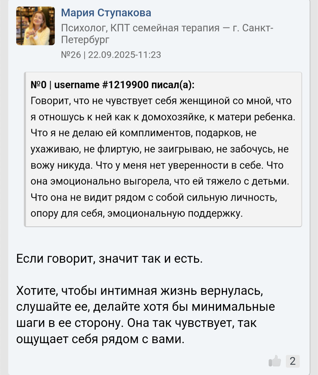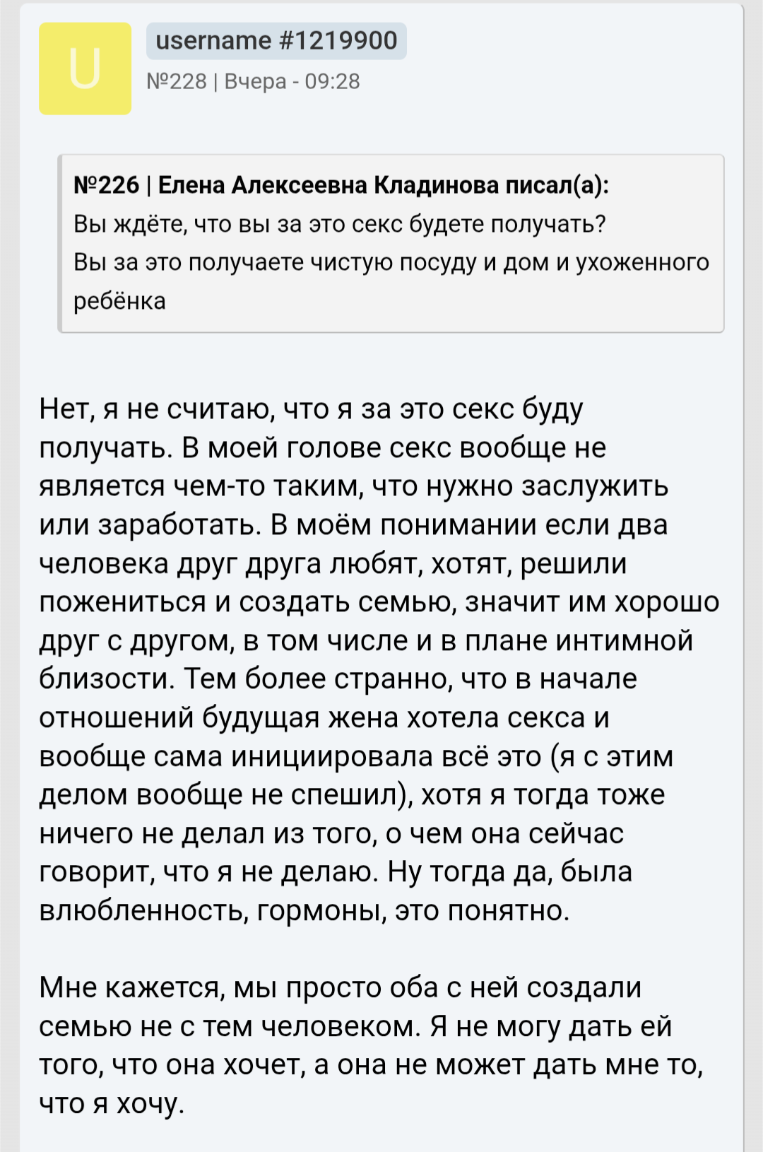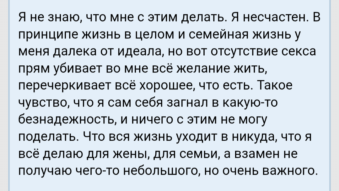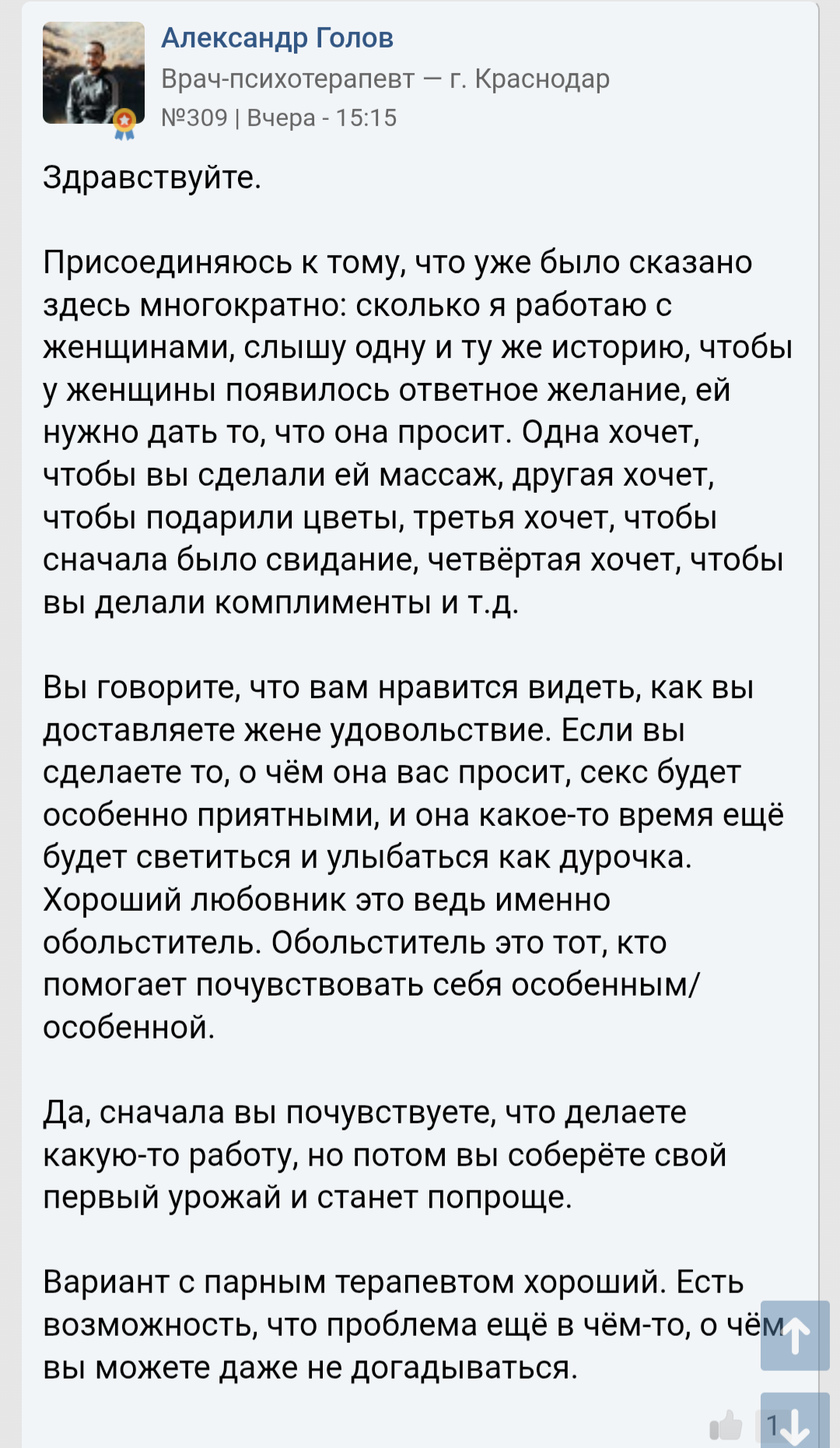 Интересно, он так никогда и не поймет, что его проблема не в том, что эта женщина - не та, а что любая другая будет поступать с ним точно так же? И ему за всю тему всего лишь пара человек сказали, в чем на самом деле проблема, а остальные пишут, что ему надо жену радовать, дарить подарки и делать комплименты, тогда и секс будет