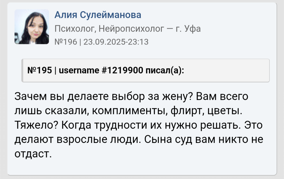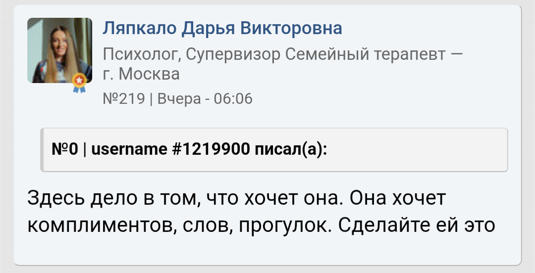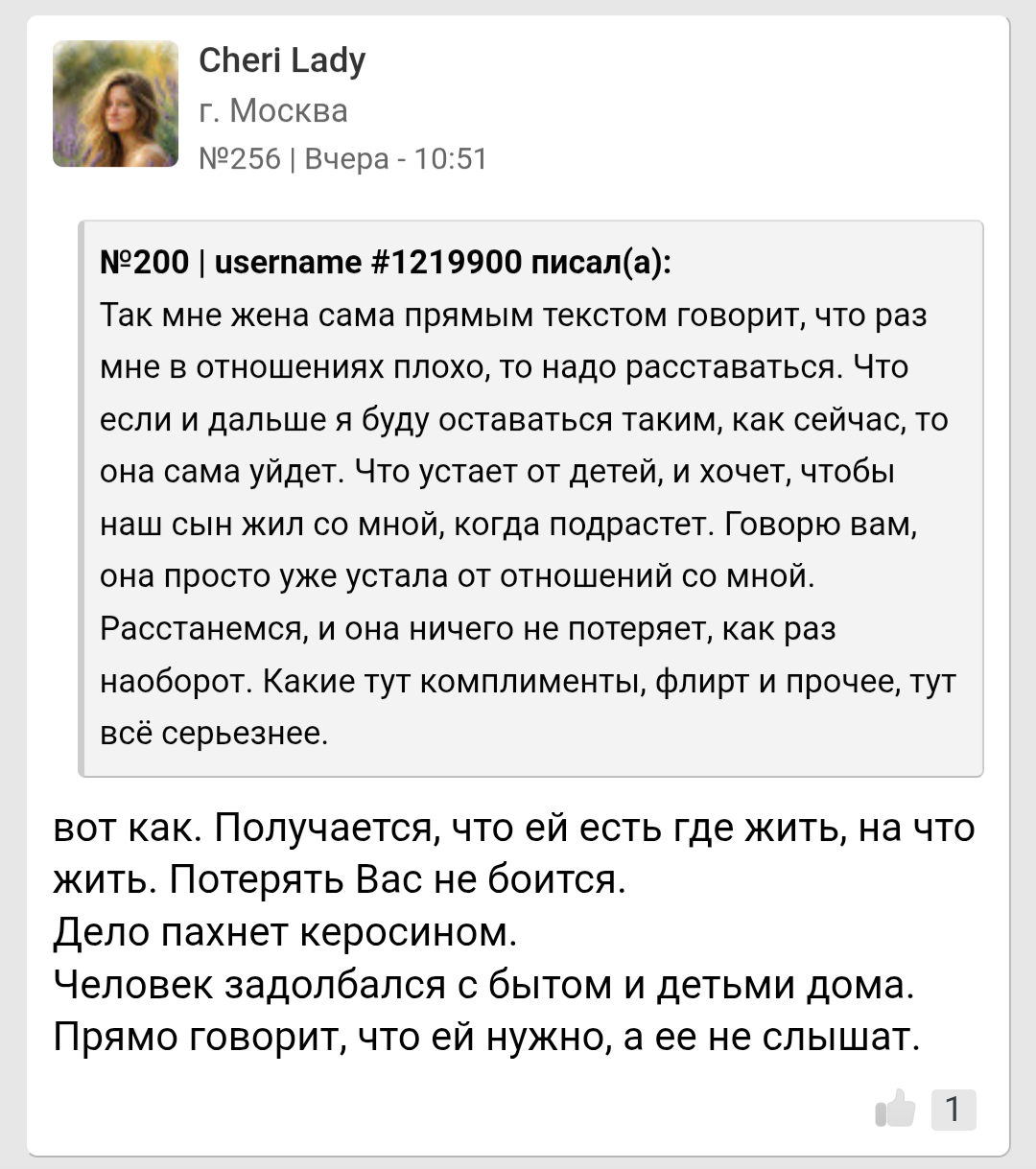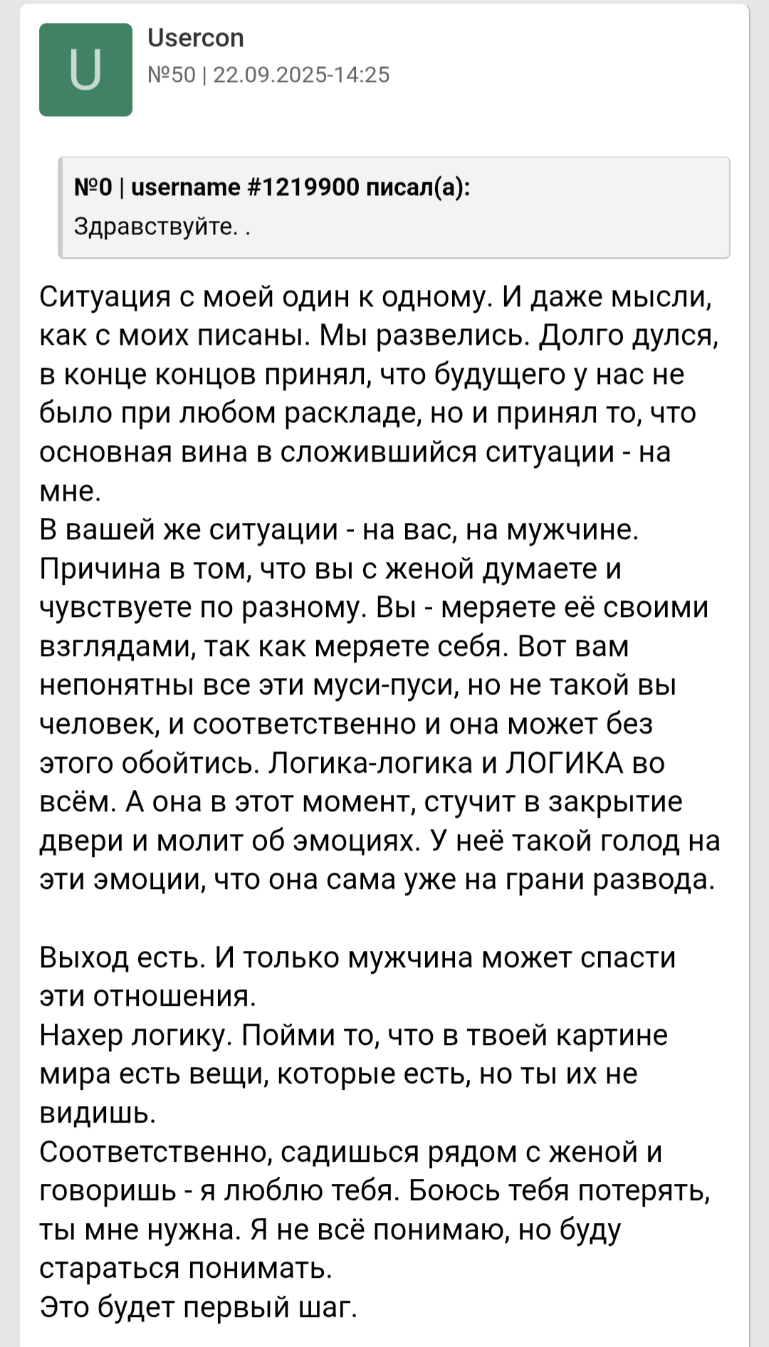 Интересно, он так никогда и не поймет, что его проблема не в том, что эта женщина - не та, а что любая другая будет поступать с ним точно так же? И ему за всю тему всего лишь пара человек сказали, в чем на самом деле проблема, а остальные пишут, что ему надо жену радовать, дарить подарки и делать комплименты, тогда и секс будет