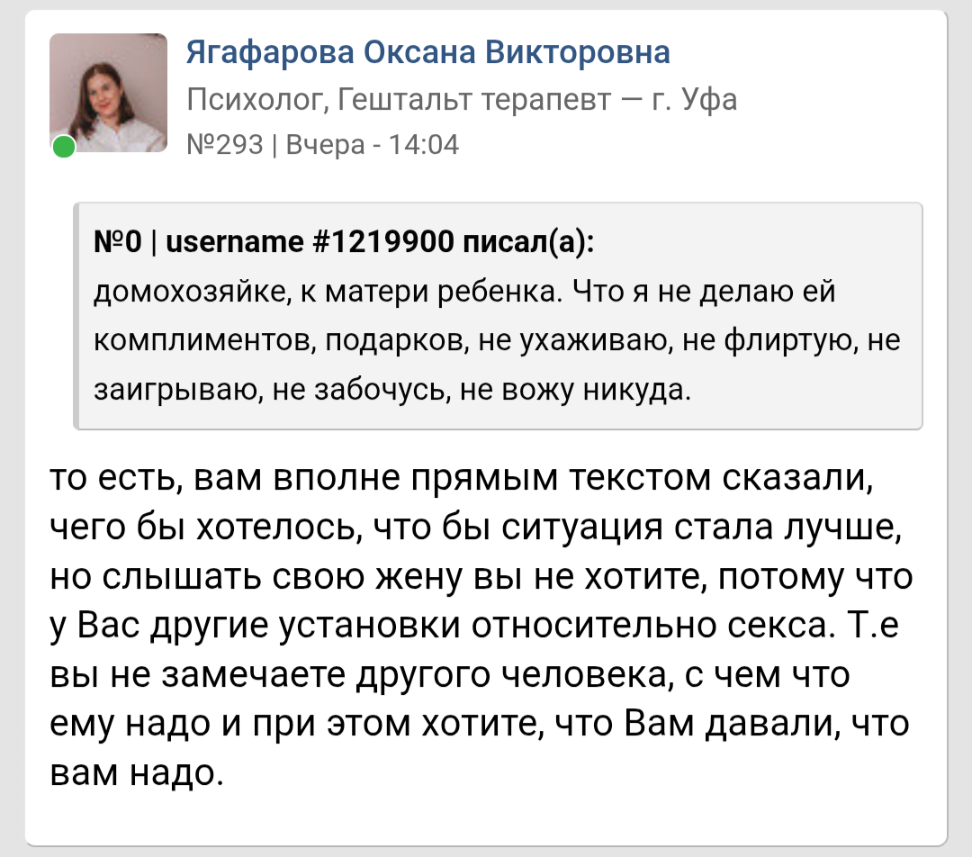 >>10344663 А разве секс - это не взаимное удовольствие для двоих? Как же тогда так выходит, что мужу, даже не просто парню, а мужу, нужно его добиваться? Как будто работа какая-то для женщины Чет, я нихуя уже не понимаю