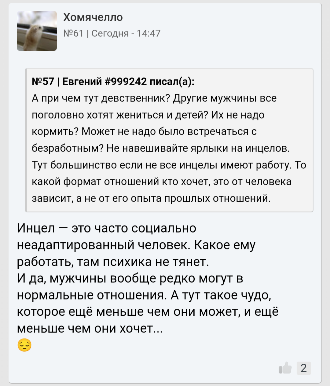 >А инцелом стал инцелом стать нельзя, "держался за ручку - не инцел", а все остальное копиум и и попытка снять с себя ответственность.