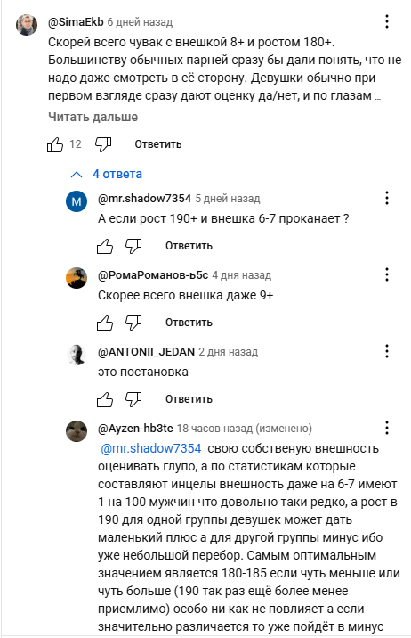 ей 28. И она когда видела челика 185+ роста, но на внешку нормиса, то первая реакция была отвращение, даже на прощание не хотела обниматься с ним и в результате отшила, так что у нее даже есть планка
