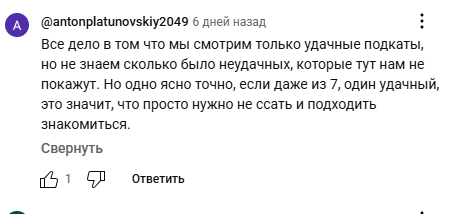 Да ну на хуй, это как лол?) у меня совершенно другой опыт, сельдям настолько похуй, что ни одну даже на свидание не вытащить. Это вообще для меня было открытием в свое время - насмотревшись фильмов, я так себе представлял личную жизнь, что ты приглашаешь разных баб на свидание, а уже там, в зависимости от того, как ты себя вел на свидании и что говорил, у вас что-то получается или нет. Никто не готовил меня к реалиям: никаких свиданий тупо нет, если ты не уродился дегенератом с квадратным еблом, ты ни на кофе, ни в ресторан ни одну селёдку не вытащишь. Тарелочниц ваших мифических я тоже так и не встретил за всю жизнь