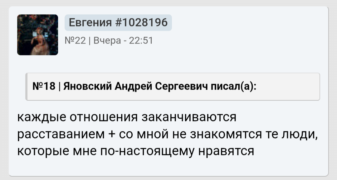 Да уж... Хотя, в моей ситуации дело не только и не столько в межполовых отношениях, хотя, конечно же, они очень влияют на состояние. Но у меня в целом жизнь не сложилась процентов на 90%