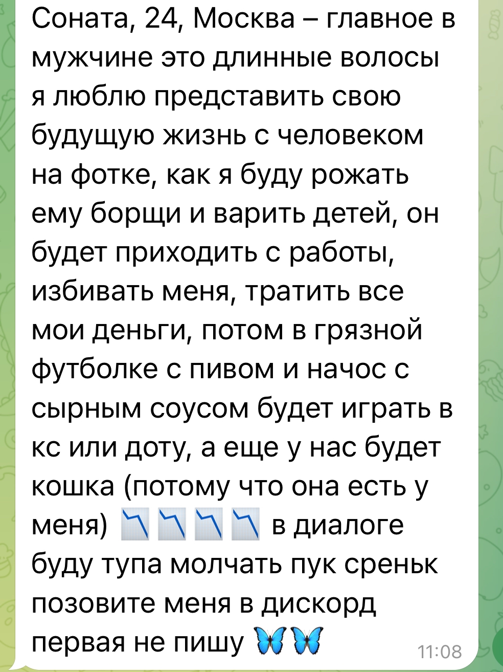 Чтобы там не писали инцелы о легкодоступности отношений и секса для женщин, но все вышеперечисленное работает и в обратную сторону к нам: игнор,грубое отношение, внезапное удаление переписок, нежелание переходить в тг. Сайты знакомств порочны в обе стороны