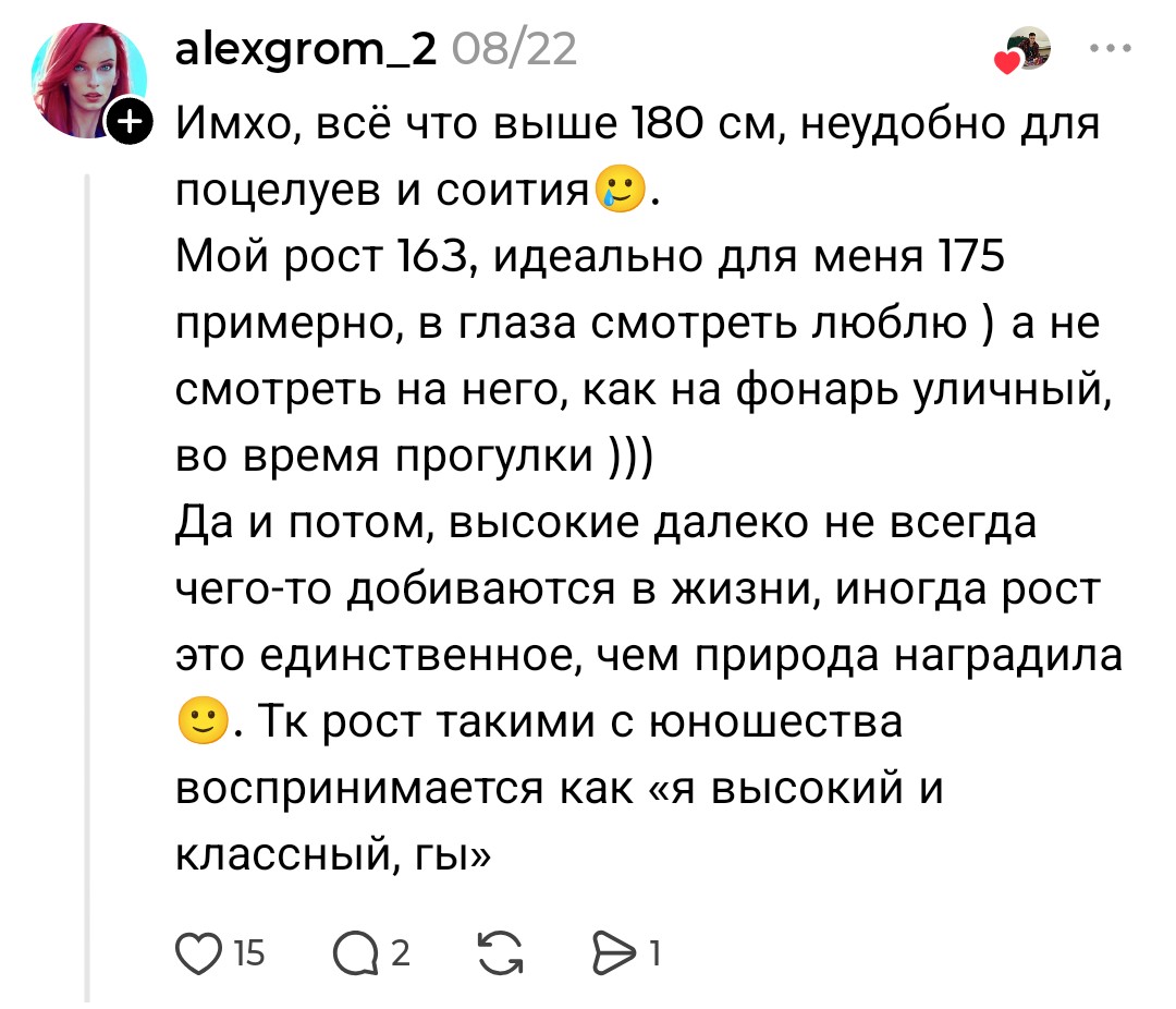 >>10351984 суммарно взять всех тянок которые отписали за рост, то там больше лайков будет. Меньшиству нравится низкий рост, но не исключает их. Тебе нужно много тян или одна ? Всё равно все сводится к одной, так лучше найти ту которой все подойдет в тебе
